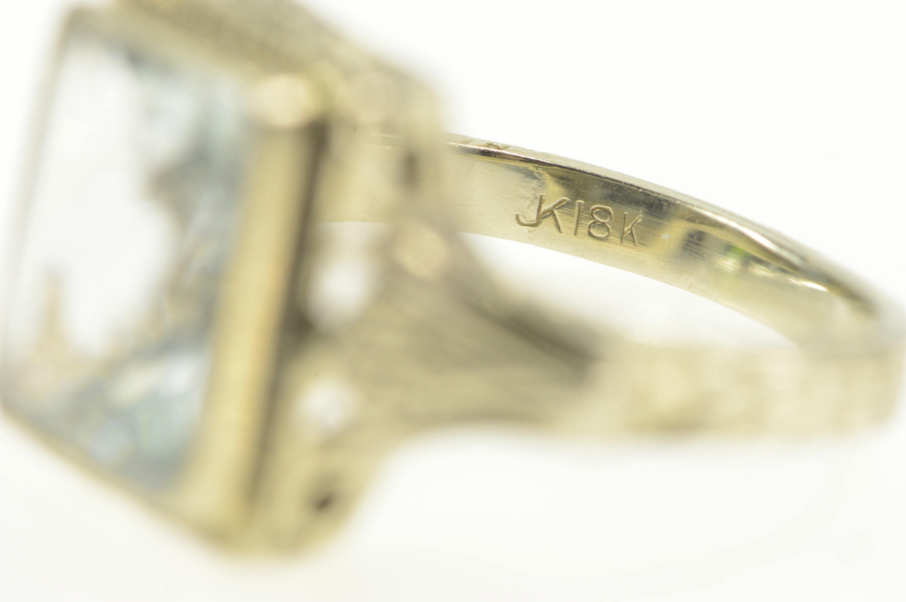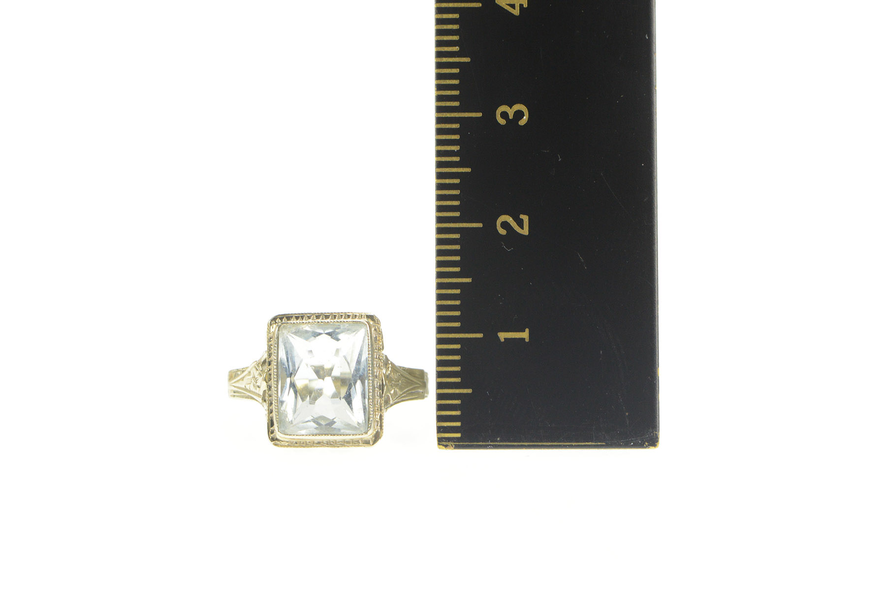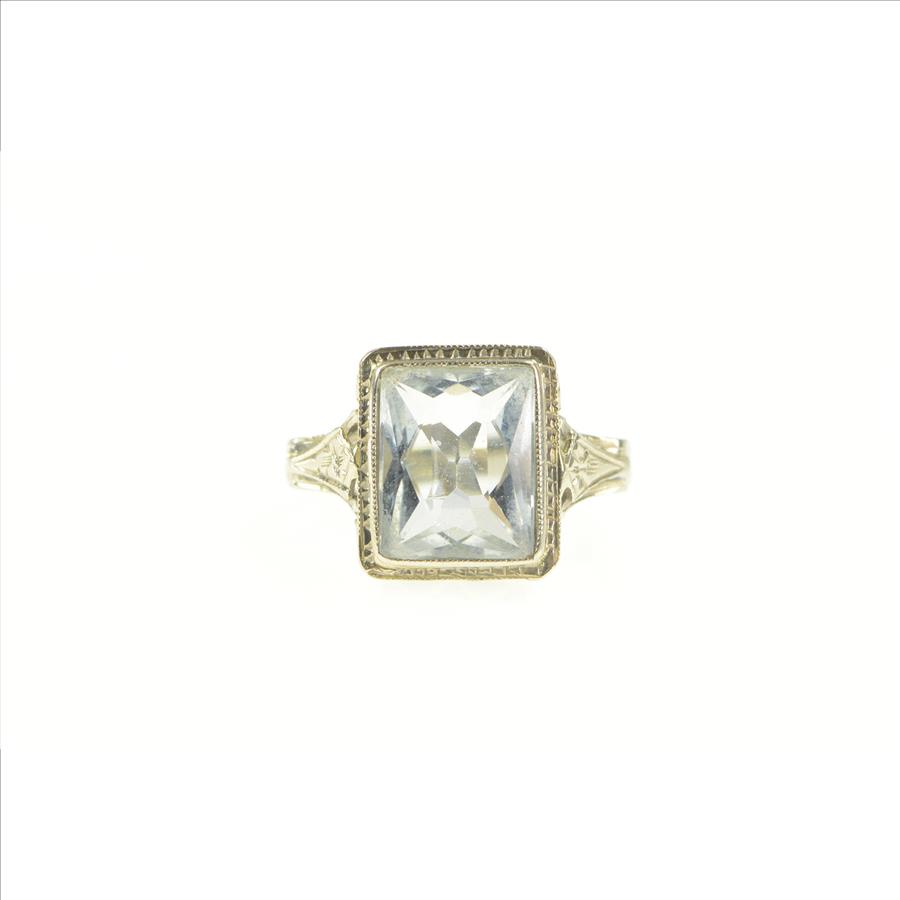 Item:  18K Art Deco Emerald Cut Aquamarine Filigree Yellow Gold Ring, Size 3