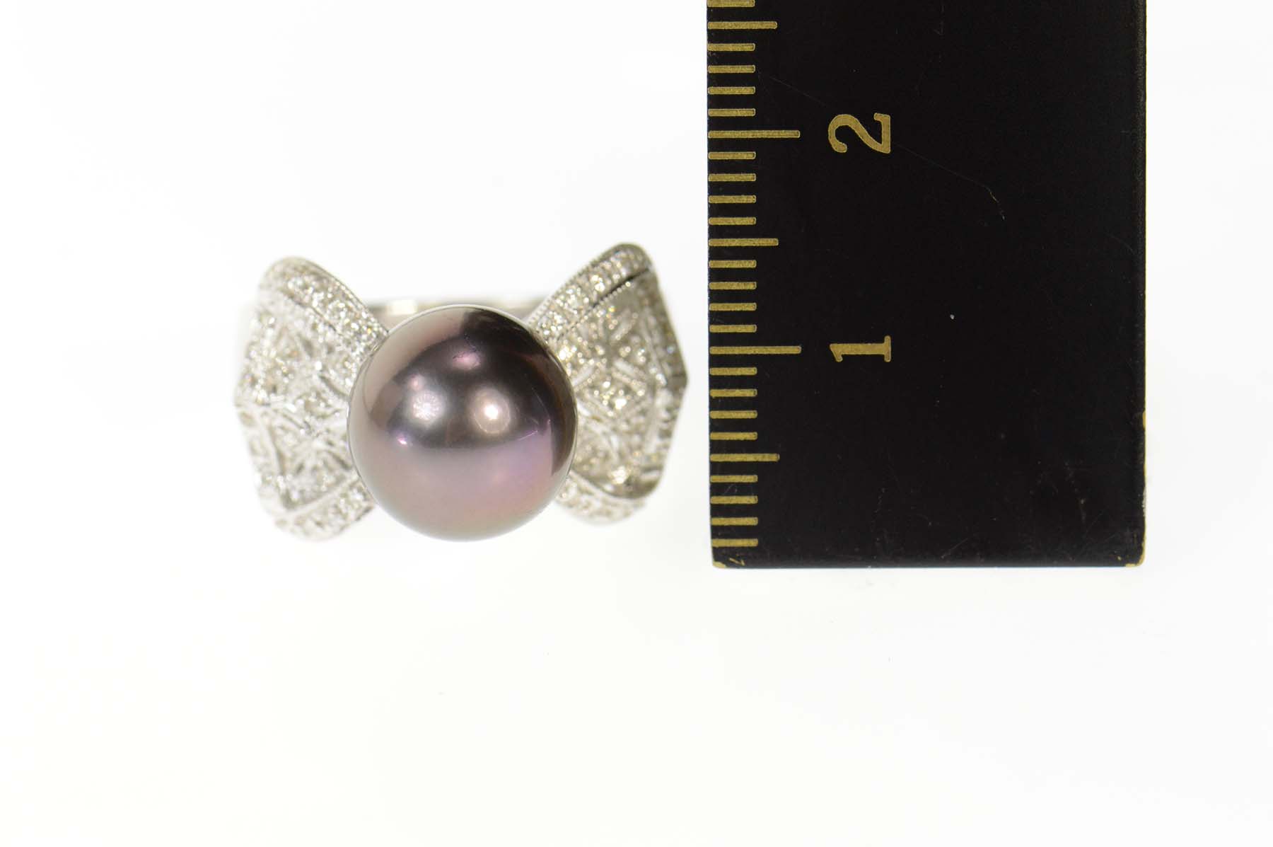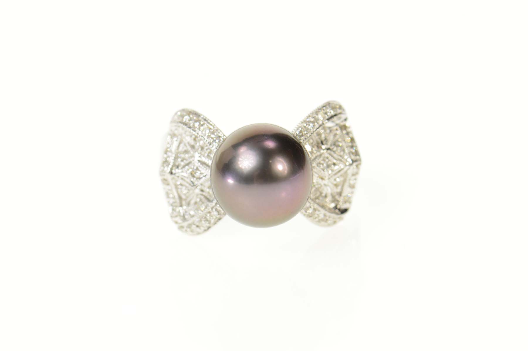 Item:  18K Black Pearl Diamond Ornate Bow Cocktail White Gold Ring, Size 6.75