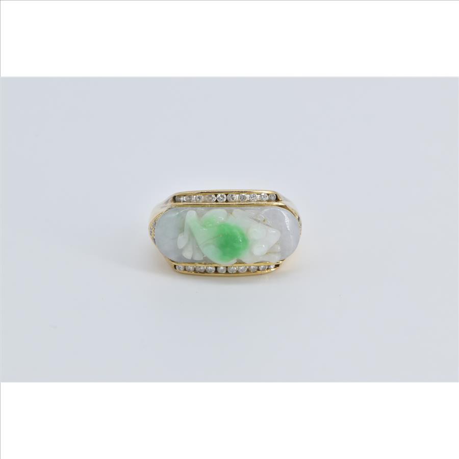 Item:  18K Carved Jade Frog Diamond Chinese Statement Yellow Gold Ring, Size 9.25