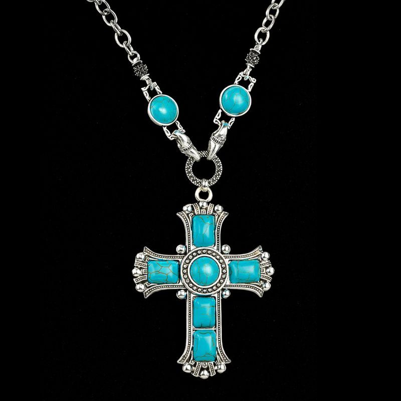 18K White Gold Overlay Large Turquoise Cross Necklace