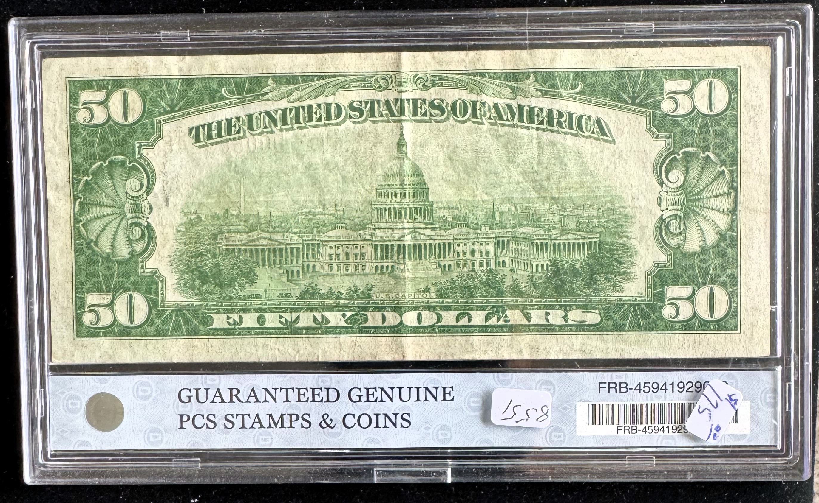 1929 SERIES $50 DOLLAR U.S. NATIONAL CURRENCY, CLEVELAND, PCS GUARANTEED, RED SEAL, IN A HARD SLAB