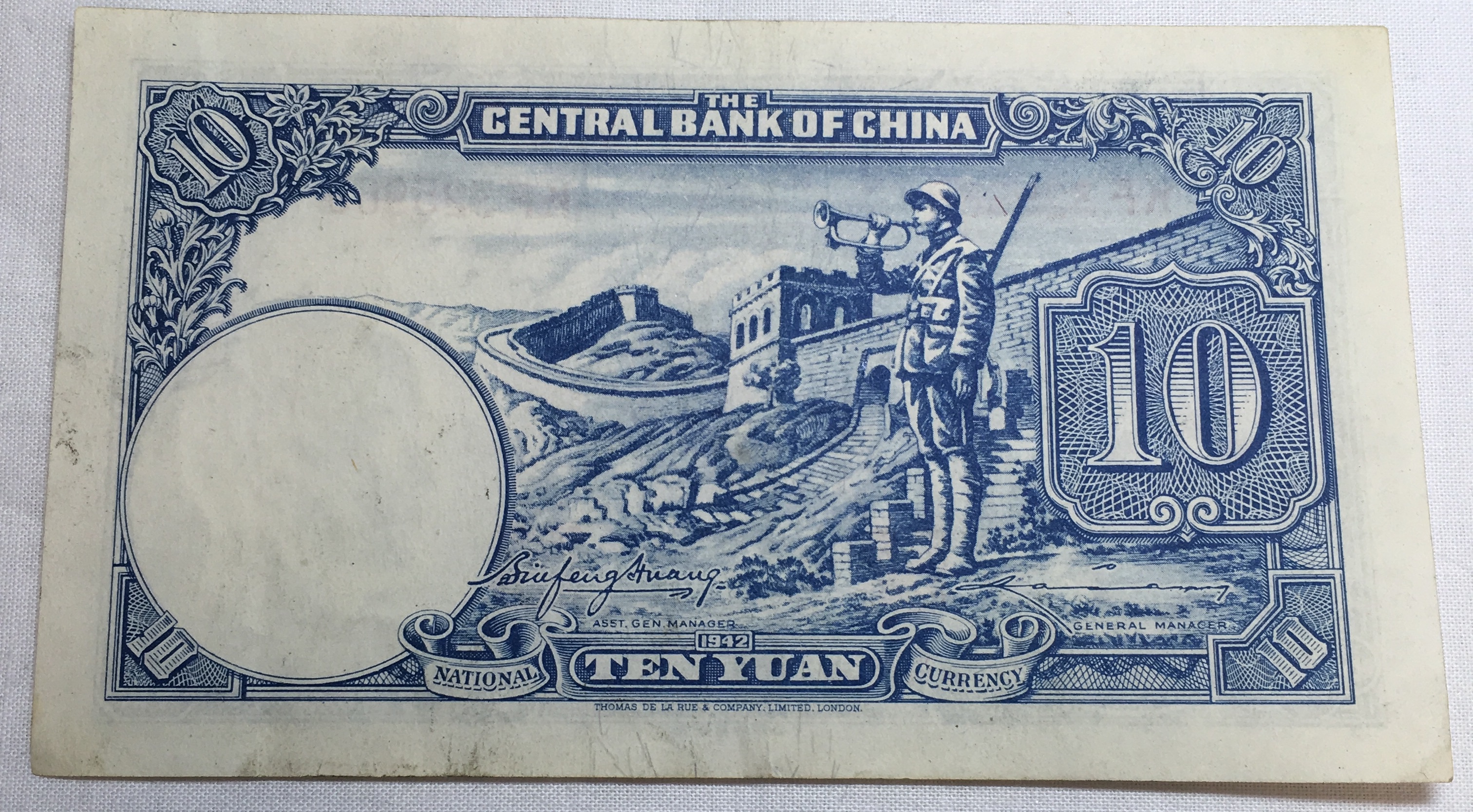 1942 Central Bank of China 10 Yuan Bank Note - High Grade Crisp Condition
