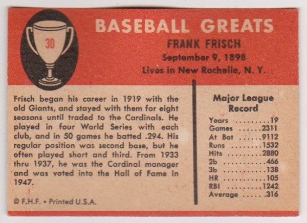 1961 Fleer Frankie Frisch #30 Card - HOF'er