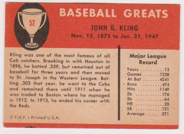 1961 Fleer Johnny Kling #52 Card
