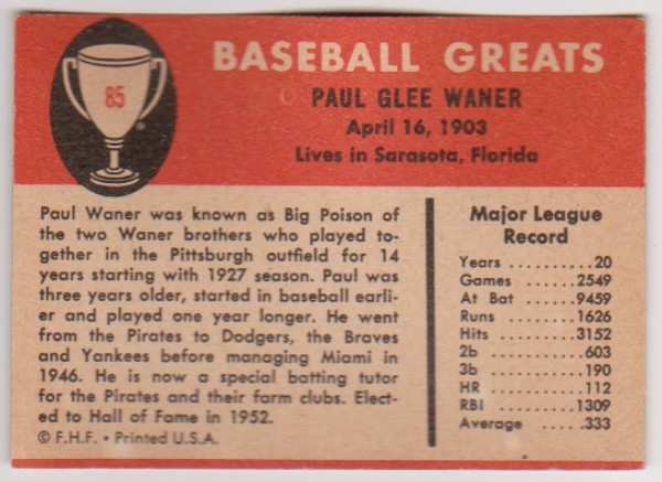 1961 Fleer Paul Waner #85 Card - HOF'er