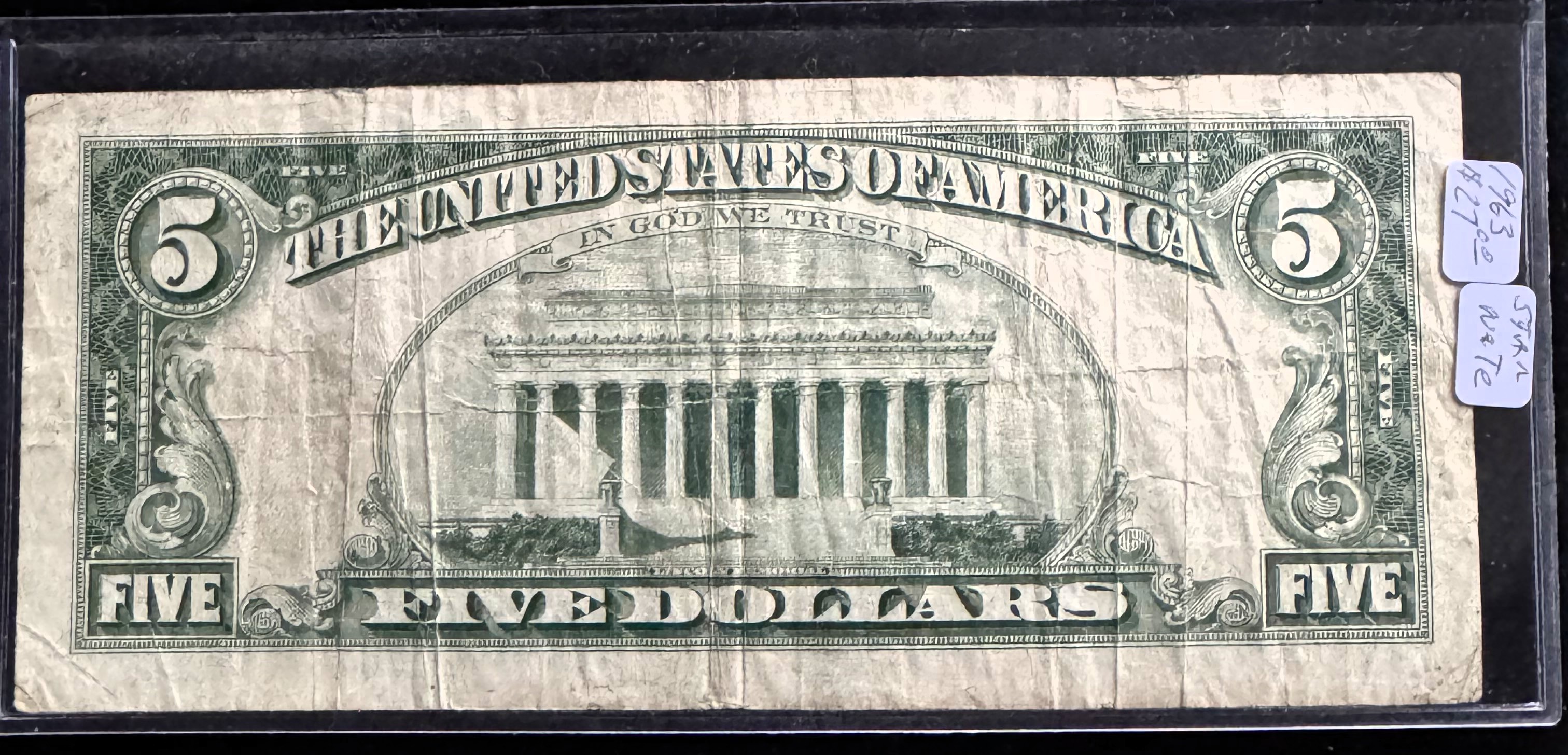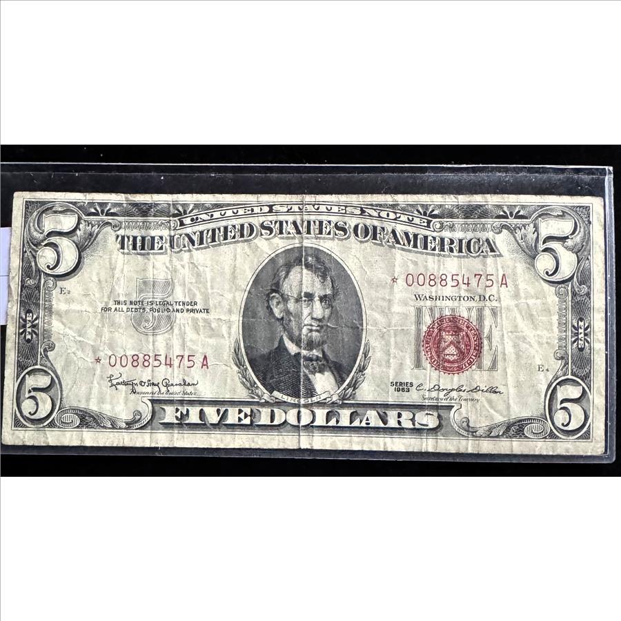 1963 SERIES $5 DOLLAR "STAR NOTE", RED SEAL IN A SLEVE