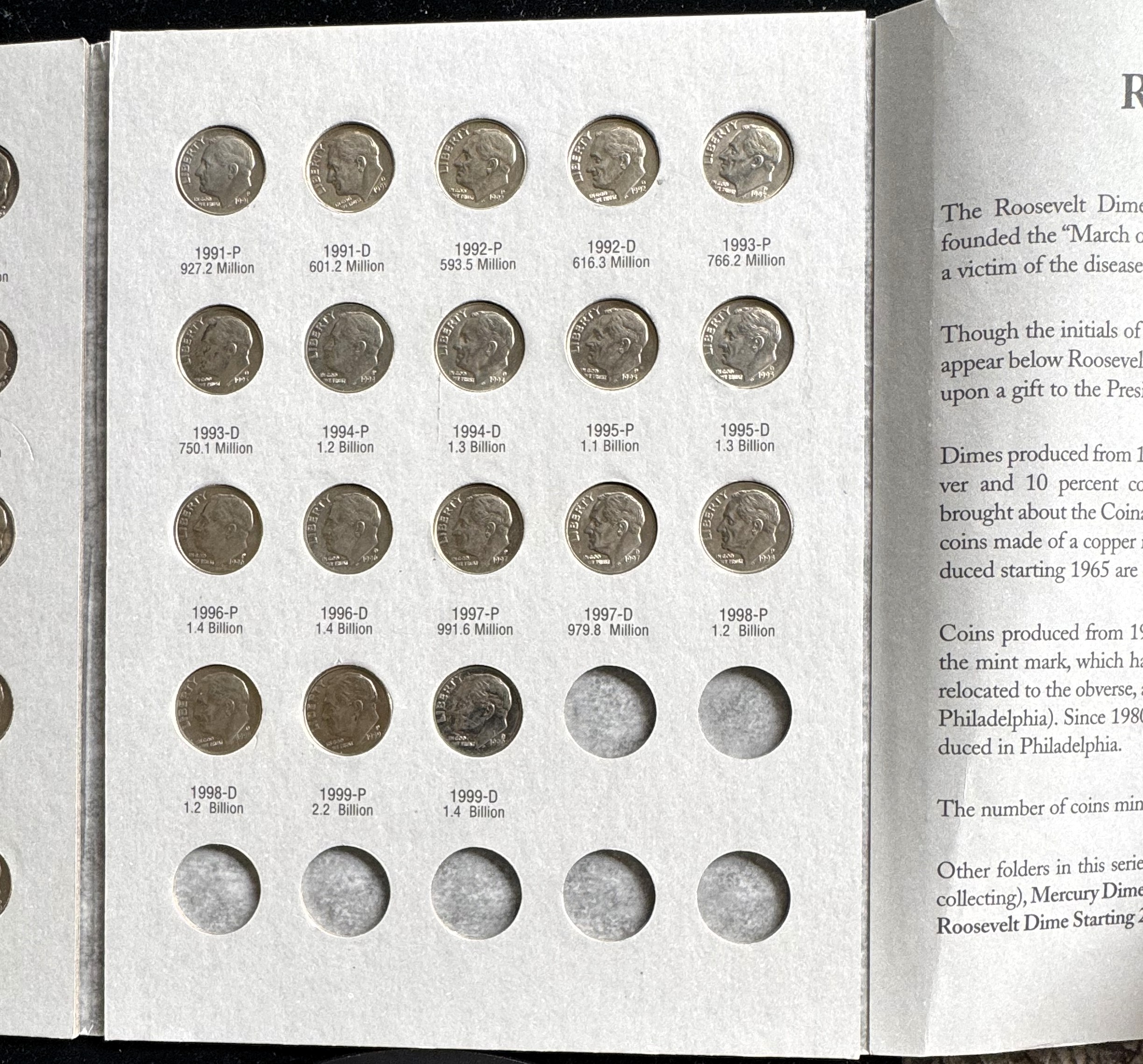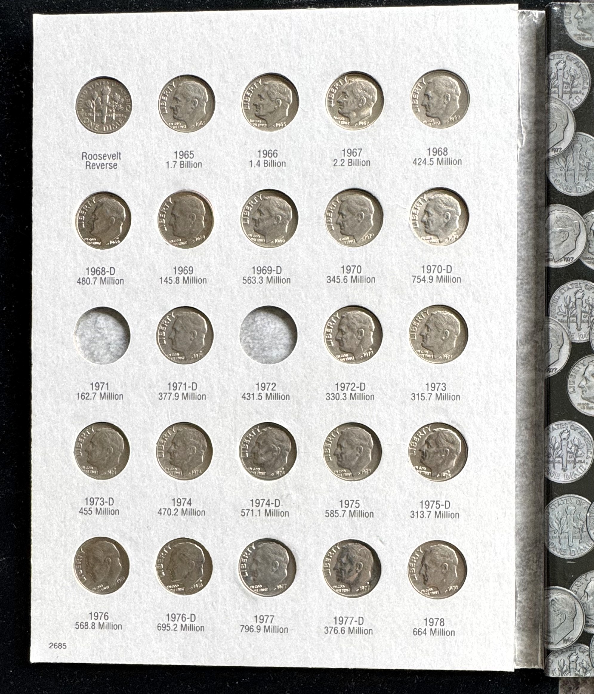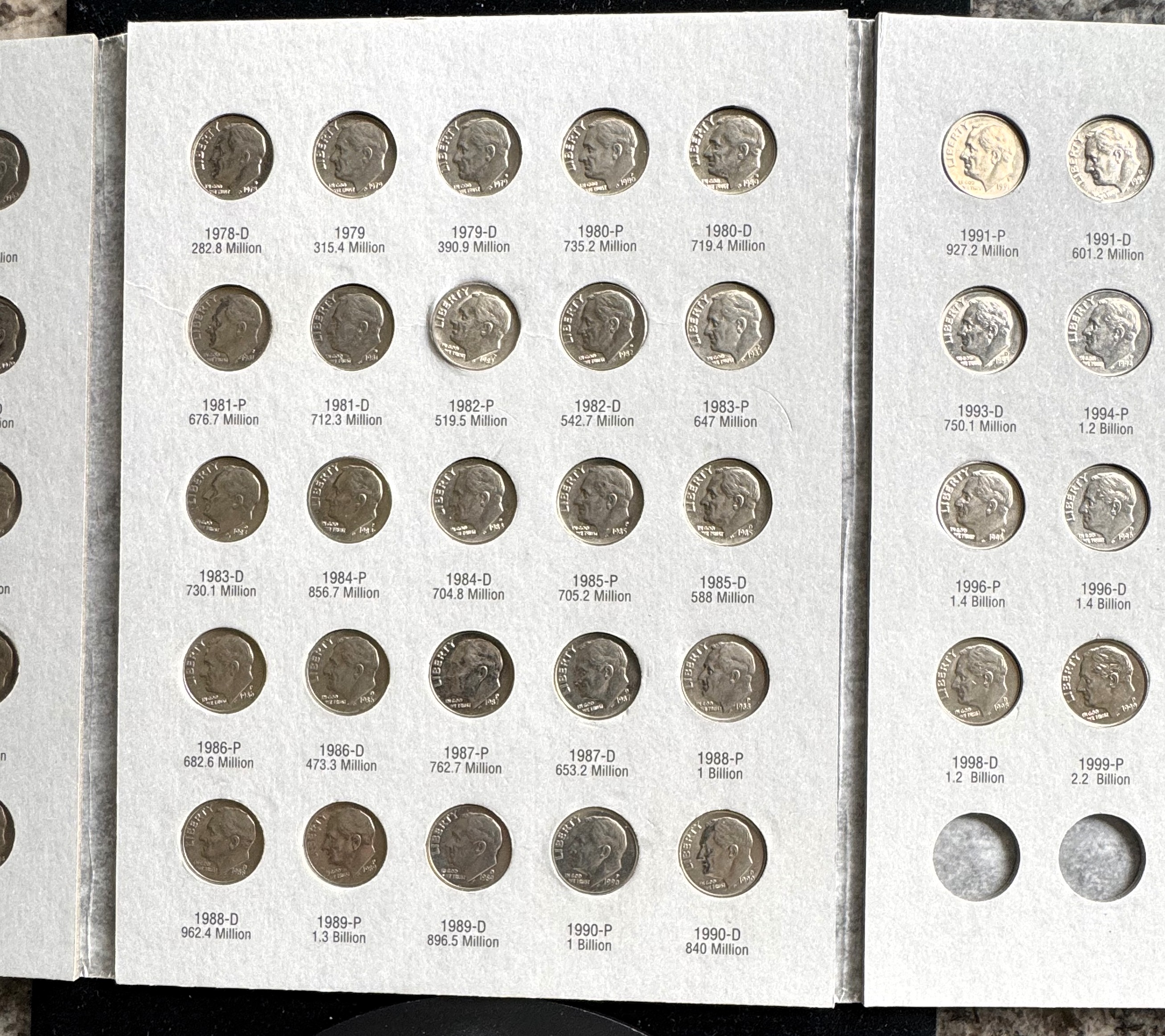 1965-1999 ROOSEVELT DIMES COIN SET, NEAR COMPLETE, HIGH QUALITY, IN A HARRIS COIN BOOK