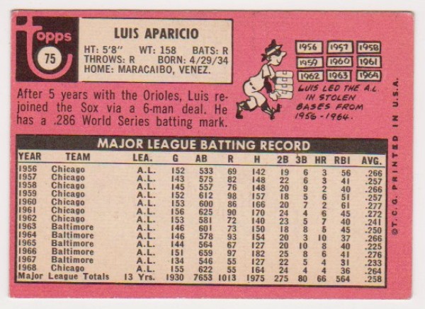 1969 Topps Luis Aparicio #75 Card - HOF'er