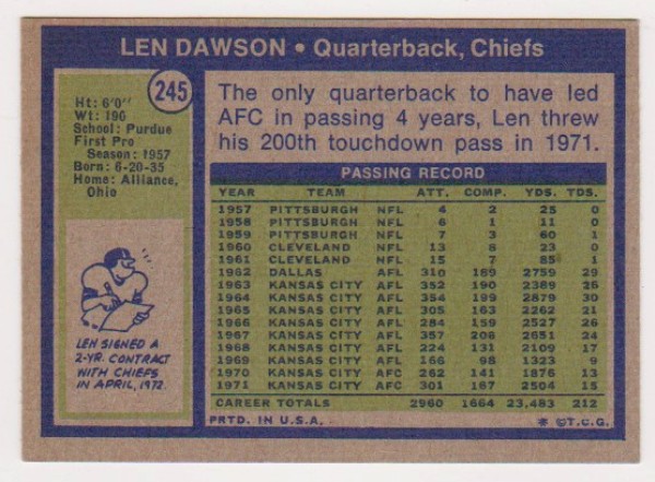 1972 Topps Len Dawson #245 Card - HOF'er