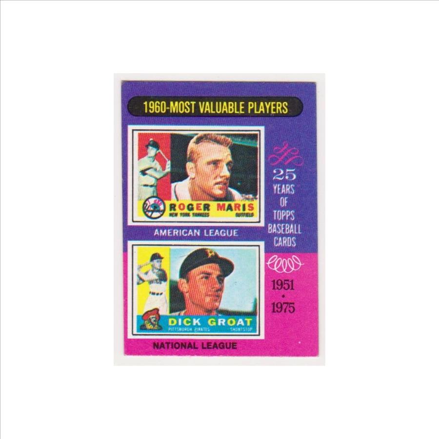 This is an authentic 1975 Topps Mini Roger Maris/Dick Groat #198 card.  This one commemorated Maris and Groat winning the baseball MVP awards in 1960 and features a photo of each of their 1960 Topps cards on the front.  It is in approximately VG-EX to EX condition.  The card has minor wear and is slightly miscut, but overall displays pretty well in a holder.  This is an original 51 year old card featuring both of these two baseball stars.