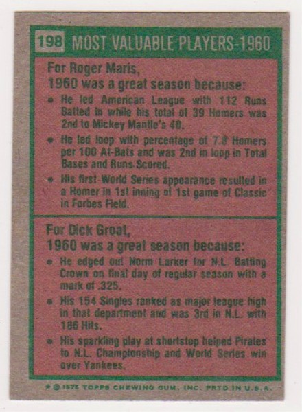 1975 Topps Mini Roger Maris/Dick Groat #198 Card