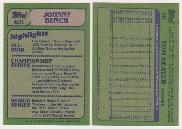 1982 Topps Johnny Bench #401 + Tom Seaver #30 Card Pair - HOF'ers