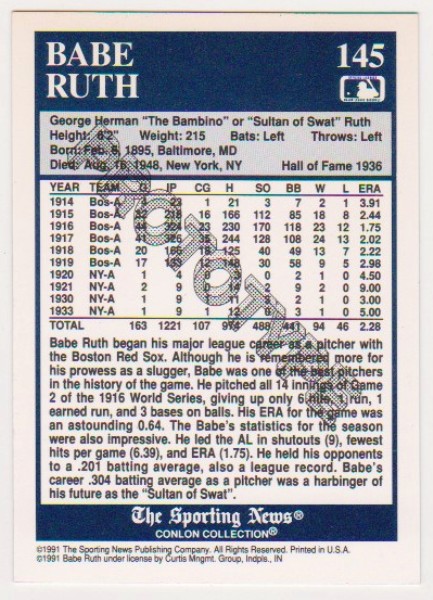 1991 Conlon Babe Ruth #145 PROTOTYPE Card - Scarce Promo