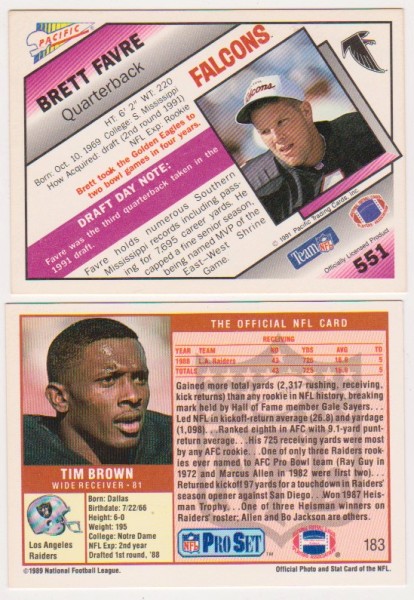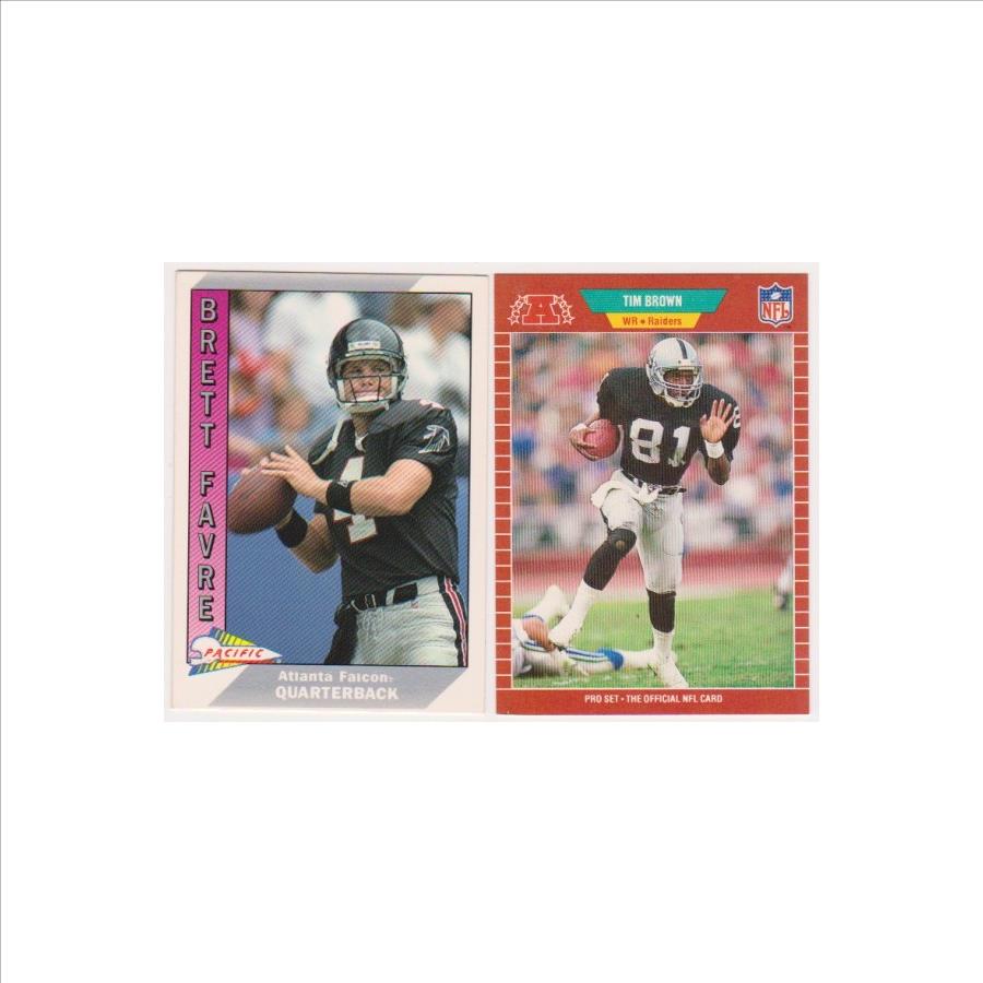 This is a pair of football rookie cards.  You get one each of 1991 Pacific Brett Favre #551 and 1989 Pro Set Tim Brown #183.  These are in approximately VG-EX to EX condition. They have some corner/edge wear, but overall display fairly well. This is an original pair of rookies of these NFL Hall Of Famers.