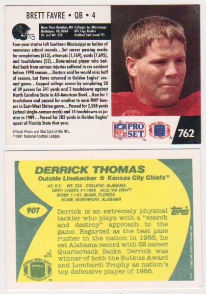 1991 Pro Set Brett Favre #762 + 1989 Topps Traded Derrick Thomas #90T Rookie Card Pair