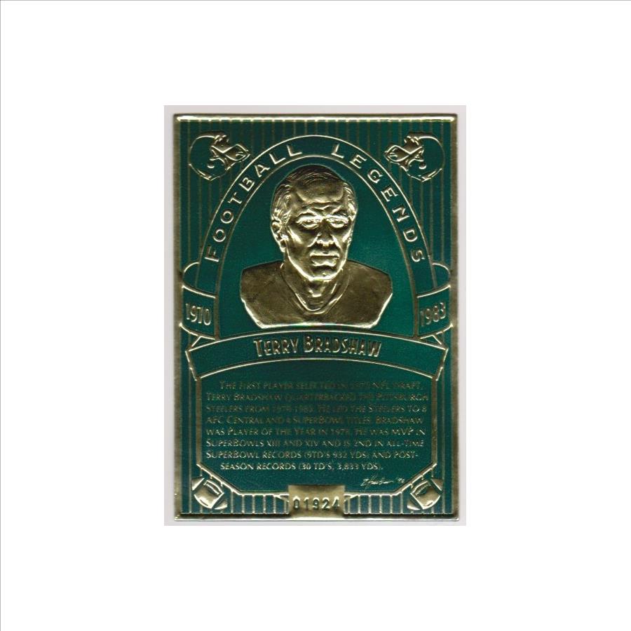 This is a 1993 Legendary Foils Terry Bradshaw 3x5 card.  This sculpted Bradshaw card comes with the original coa.  It was stamped with serial #1924.  This is a sharp low production item of this legendary Hall of Famer.