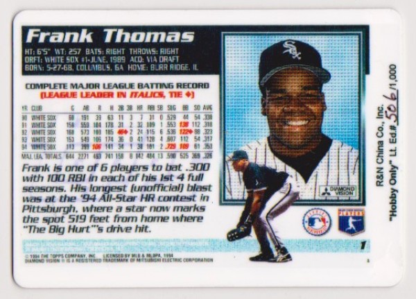 This is a 1995 Topps Frank Thomas #1 porcelain card.  This is a limited edition serial numbered piece.  It is hand numbered on the back of the card and this one is #506/1000.  This is not a cardboard card.  It is a porcelain card that was produced in very low quantities and is in like new condition.