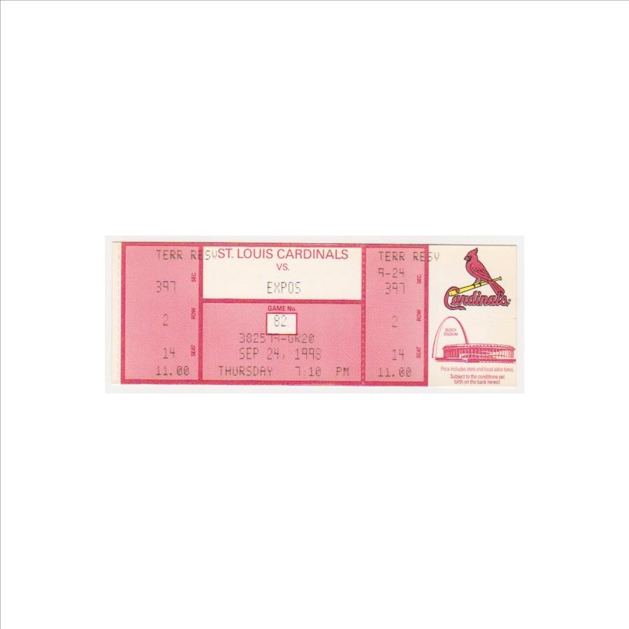 This is an original baseball ticket from September 24, 1998. This was for the St. Louis Cardinals vs. Montreal Expos game. This authentic ticket has minor wear, but was never used and has not been torn. The games from that year were mostly sellouts due to the frenzy over McGwire's quest to break the all time single season home run record so most of these tickets that are out there have been torn from being used to enter the game.  Very few of these exist that weren't used for admission and this is a great piece of history as it was part of McGwire's incredible season in which he bested Roger Maris's single season home run record.