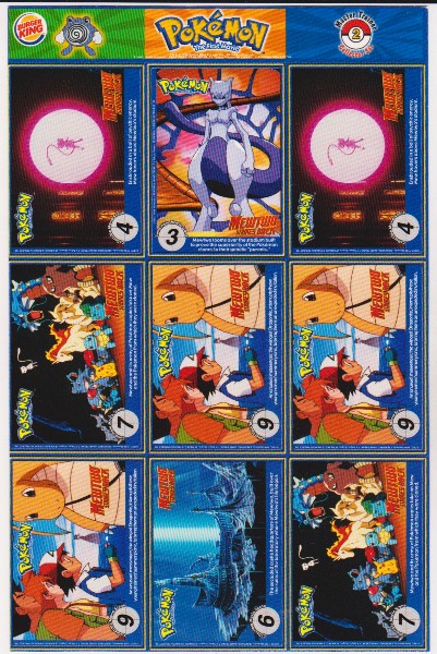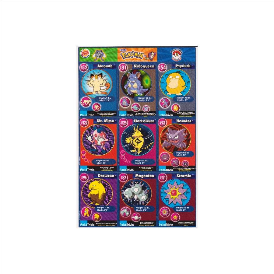 This is a 1999 Burger King Pokemon Master Trainer Collector Set Uncut Sheet.  This is sheet #2 from the set that has Meowth #52, Mr. Mime #122, Drowzee #96, Nidoqueen #31, Electabuzz #125, Magneton #82, Psyduck #54, Haunter #93 and Starmie #121.  This one has some wear including a crease on the bottom left corner of the Drowzee card, but the sheet is in approximately Very Good overall condition.  This is an original vintage sheet of 1999 Pokemon cards.