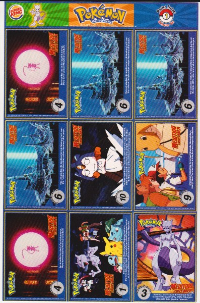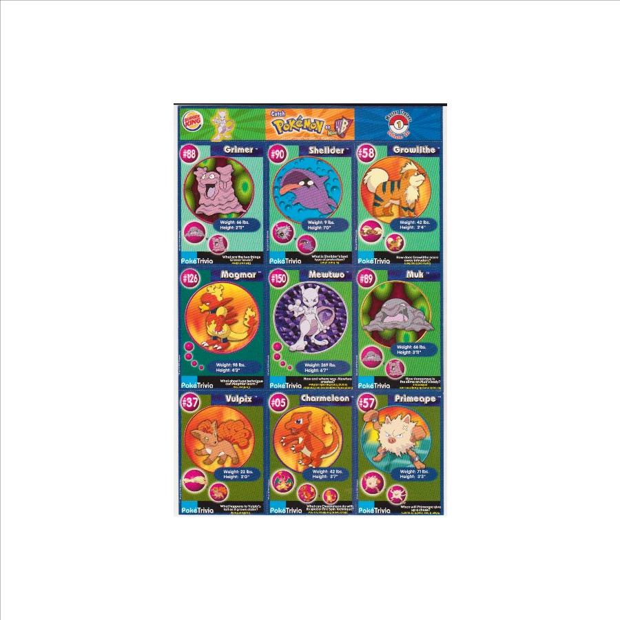 This is an original 1999 Burger King Pokemon Master Trainer Collector Set Uncut Sheet.  This is sheet #1 from the set that has Grimer #88, Shellder #90, Growlithe #58, Magmar #126, Mewtwo #150, Muk #89, Vulpix #37, Charmeleon #05 and Primeape #57.  The sheet has wear including some surface indentations on the front of the Mewtwo and Shellder cards, but is in approximately Very Good or better overall condition.  This is an original vintage sheet of 1999 Pokemon cards.