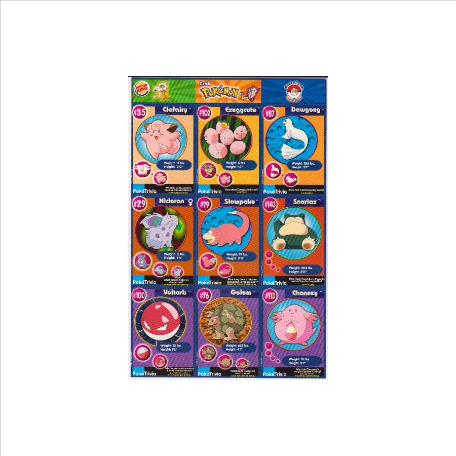 This is an original 1999 Burger King Pokemon Master Trainer Collector Set Uncut Sheet.  This is sheet #16 from the set that has Clefairy #35, Exeggcute #102, Dewgong #87, Nidoran #29, Slowpoke #79, Snorlax #143, Voltorb #100, Golen #76 and Chansey #113.  The sheet has some wear including a small bend on the bottom left corner of the Voltorb card,  but it is otherwise in approximately Excellent overall condition.  This is an original vintage sheet of 1999 Pokemon cards.