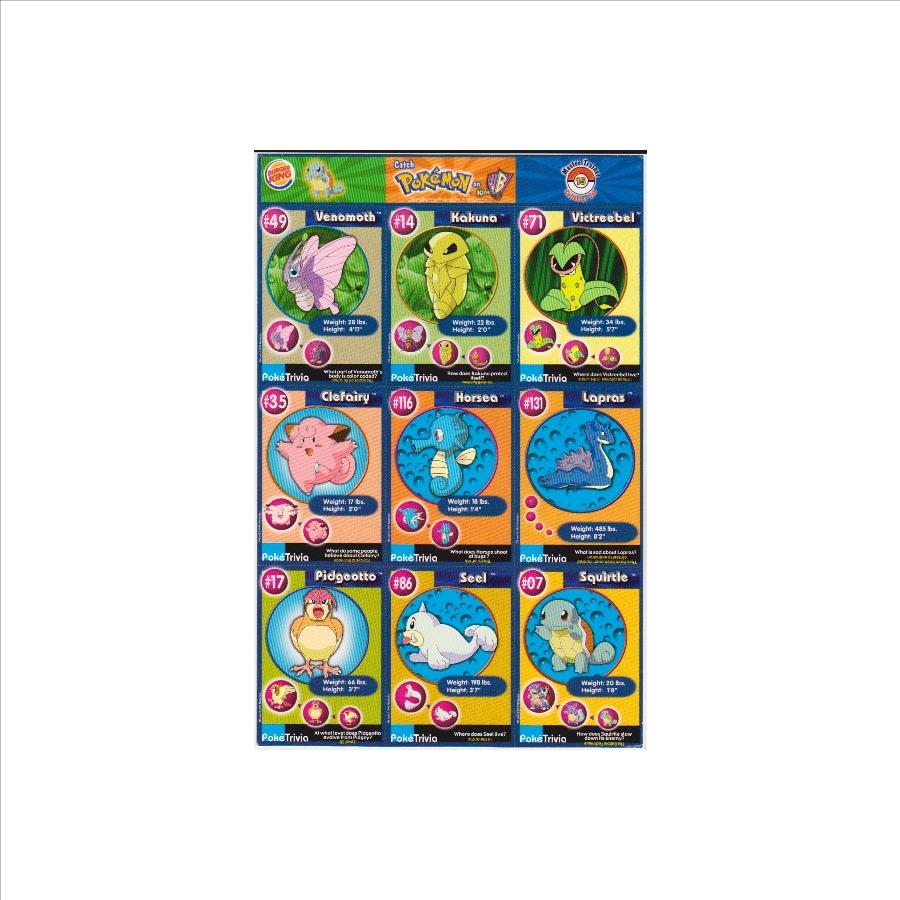 This is an original 1999 Burger King Pokemon Master Trainer Collector Set Uncut Sheet.  This is sheet #15 from the set that has Venomoth #49, Clefairy #35, Pidgeotto #17, Kakuna #14, Horsea #116, Seel #86, Victreebel #71, Lapras #131 and Squirtle #07.  The sheet has wear including a crease on the bottom right corner of the Squirtle card, but is in approximately Very Good overall condition.  This is an original vintage sheet of 1999 Pokemon cards.
