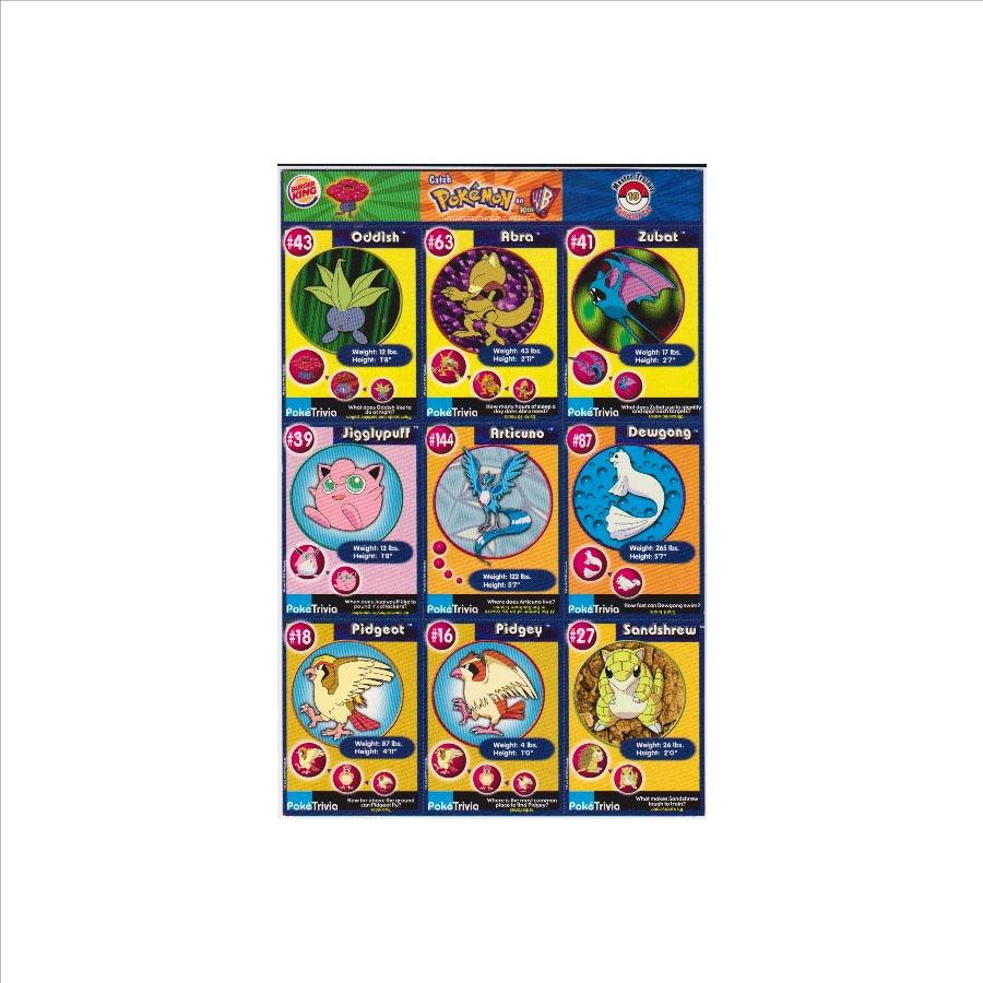 This is a 1999 Burger King Pokemon Master Trainer Collector Set Uncut Sheet.  This is sheet #19 from the set that has Oddish #43, Abra #63, Zubat #41, Jigglypuff #39, Articuno #144, Dewgong #87, Pidgeot #18, Pidgey #16 and Sandshrew #27.  This one has wear including a crease on the right edges of the Zubat card and the strip above the cards, but the sheet is in approximately Good to Very Good overall condition.  This is an original vintage sheet of 1999 Pokemon cards.