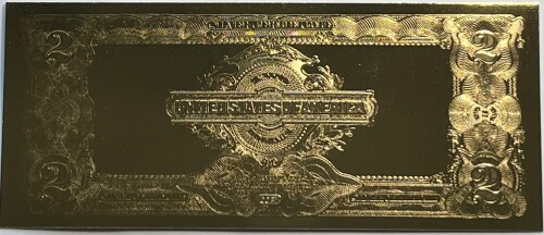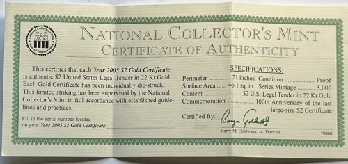 2005 $2 Gold Certificate in 22 Kt. Gold - 100th Anniv. Copy of the Last Large Size Certificate with COA