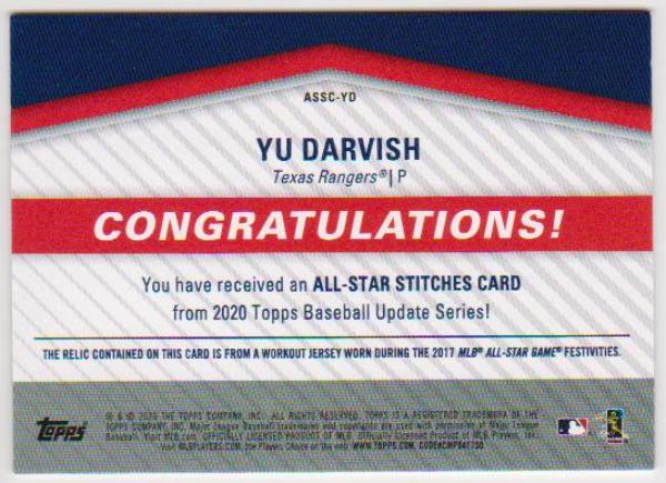 2020 Topps Update Yu Darvish All-Star Stitches Relic Worn Workout Jersey #ASSC-YD Insert Card