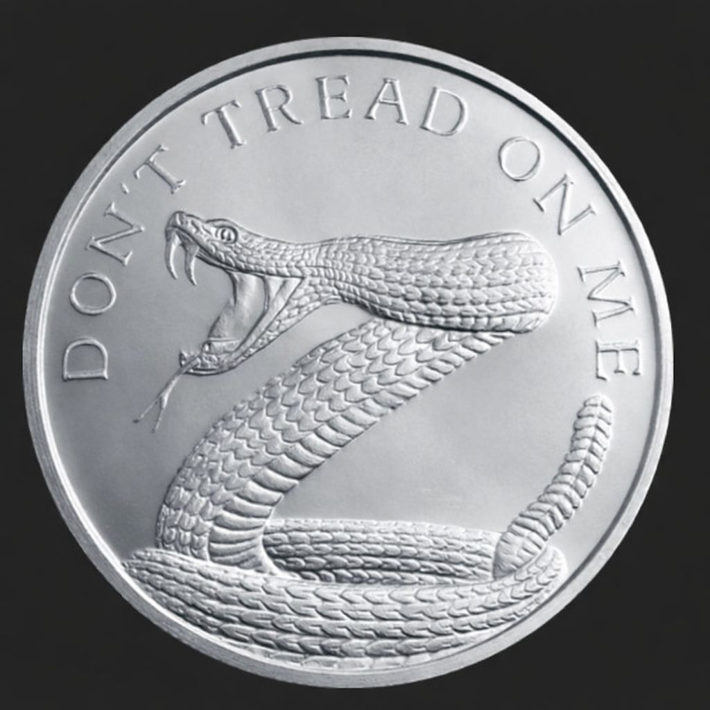 Obverse: A coiled rattlesnake bears its fangs, ready to attack, below the words "Don't Tread On Me."