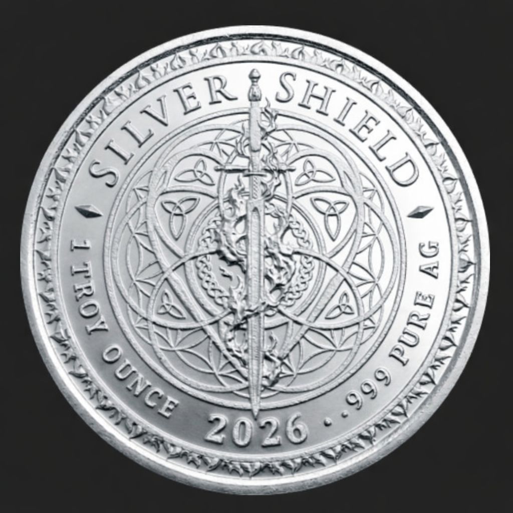 Reverse: New and improved design for the Silver Shield collection. Features a sword in the middle encircled with flames near the outer rim and the words “Silver Shield” and “1 Troy Ounce .999 Pure AG” along with the year.