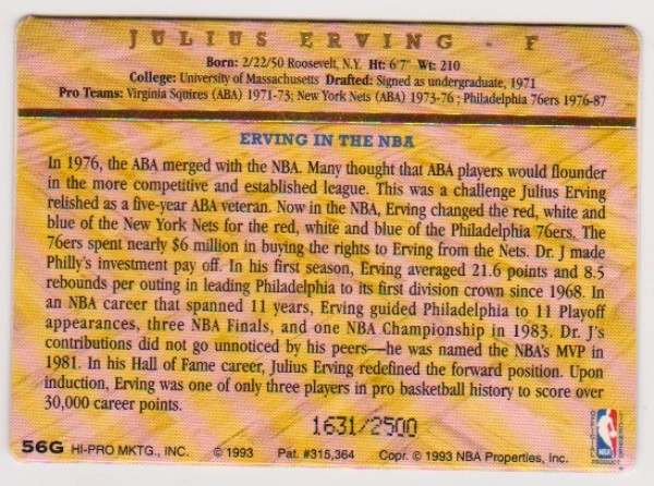 24 Kt Gold - Julius Erving - 1993 Action Packed 24 Kt Gold #56G Insert Card - #1414/2500