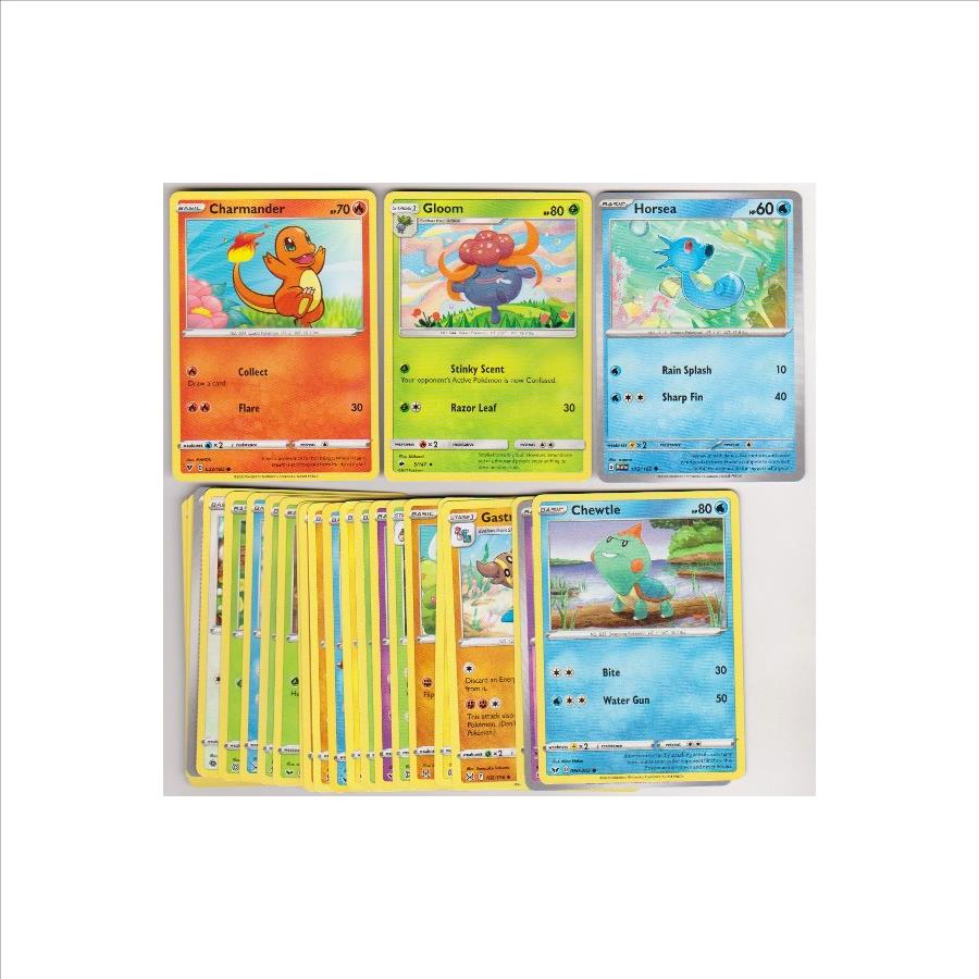 This is a collection of 25 different Pokemon trading cards.  These range from 2017 to 2023.  These are mostly in EX to Near Mint condition.  This lot includes 2020 Charmander, 2017 Gloom, 2020 Chewtle, and more.