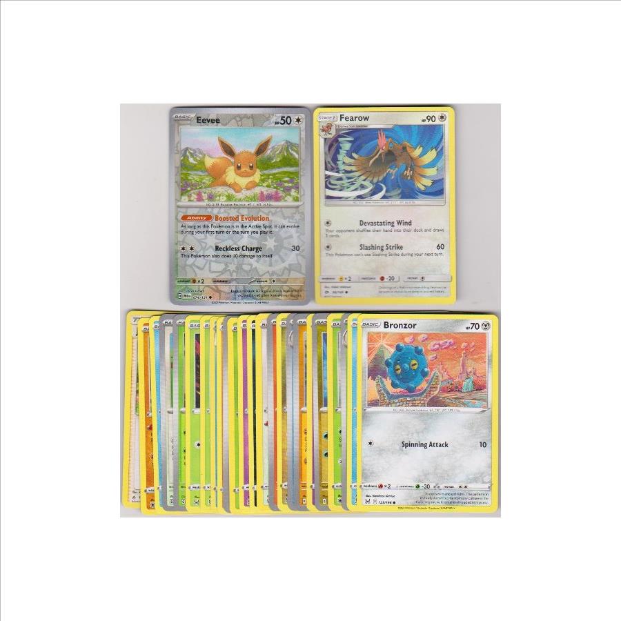 This is a collection of 25 different Pokemon trading cards.  These range from 2017 to 2025.  These are mostly in EX to Near Mint condition.  This lot includes 2025 Eevee REVERSE HOLO, 2017 Fearow, 2022 Bronzor, and more.