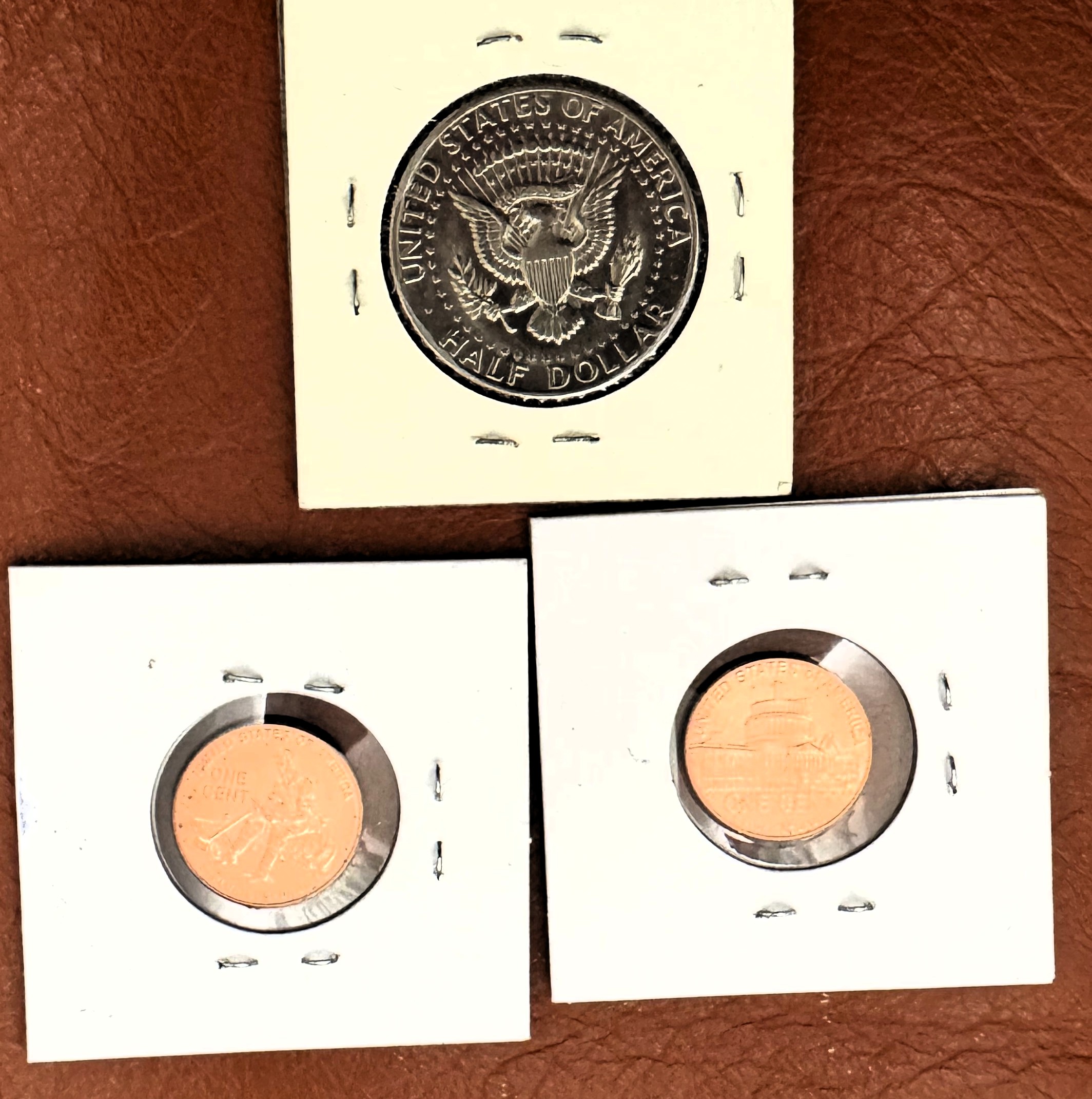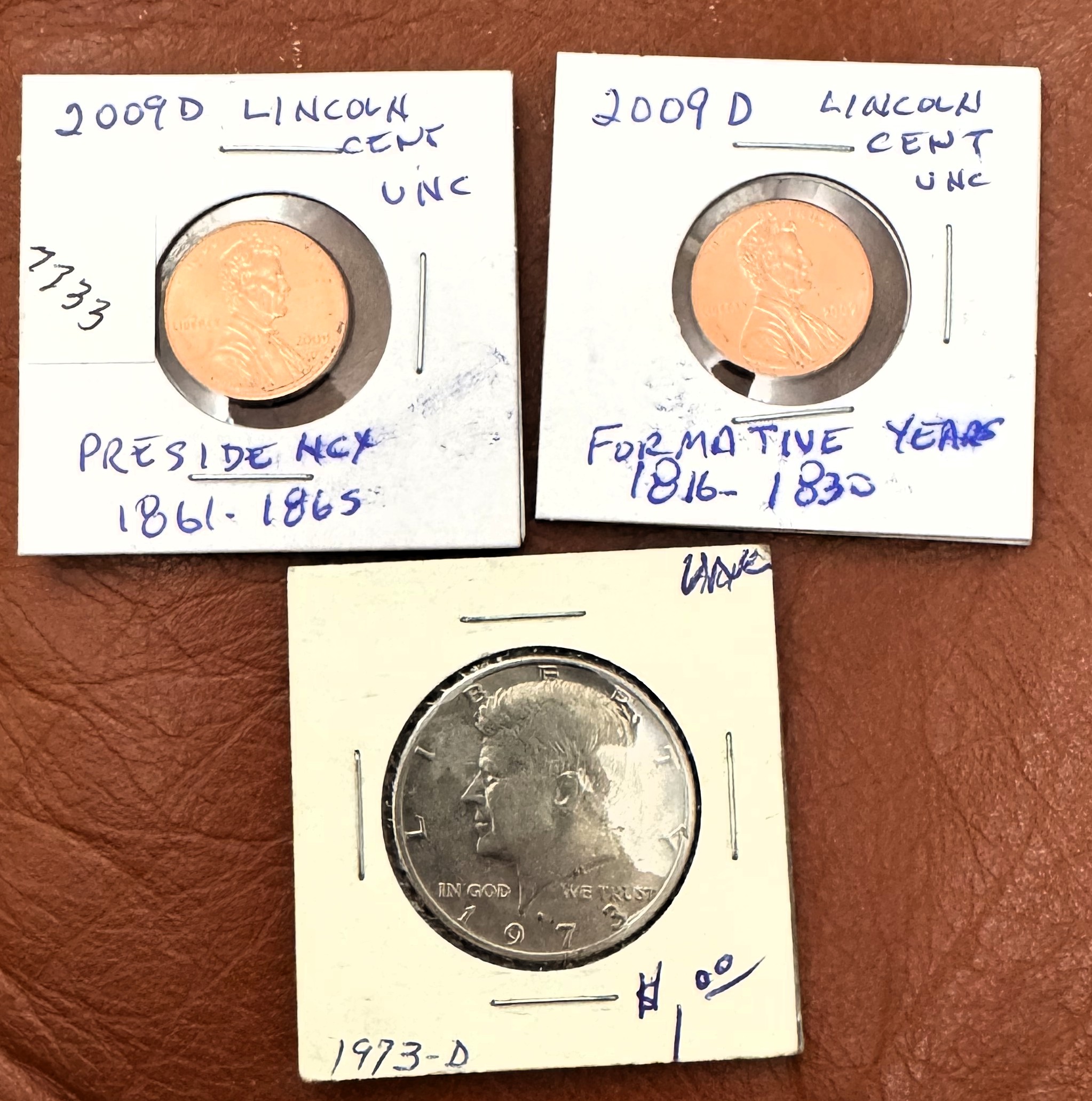 3 UNC COINS, PENNIES AND KENNEDY HALF DOLLAR