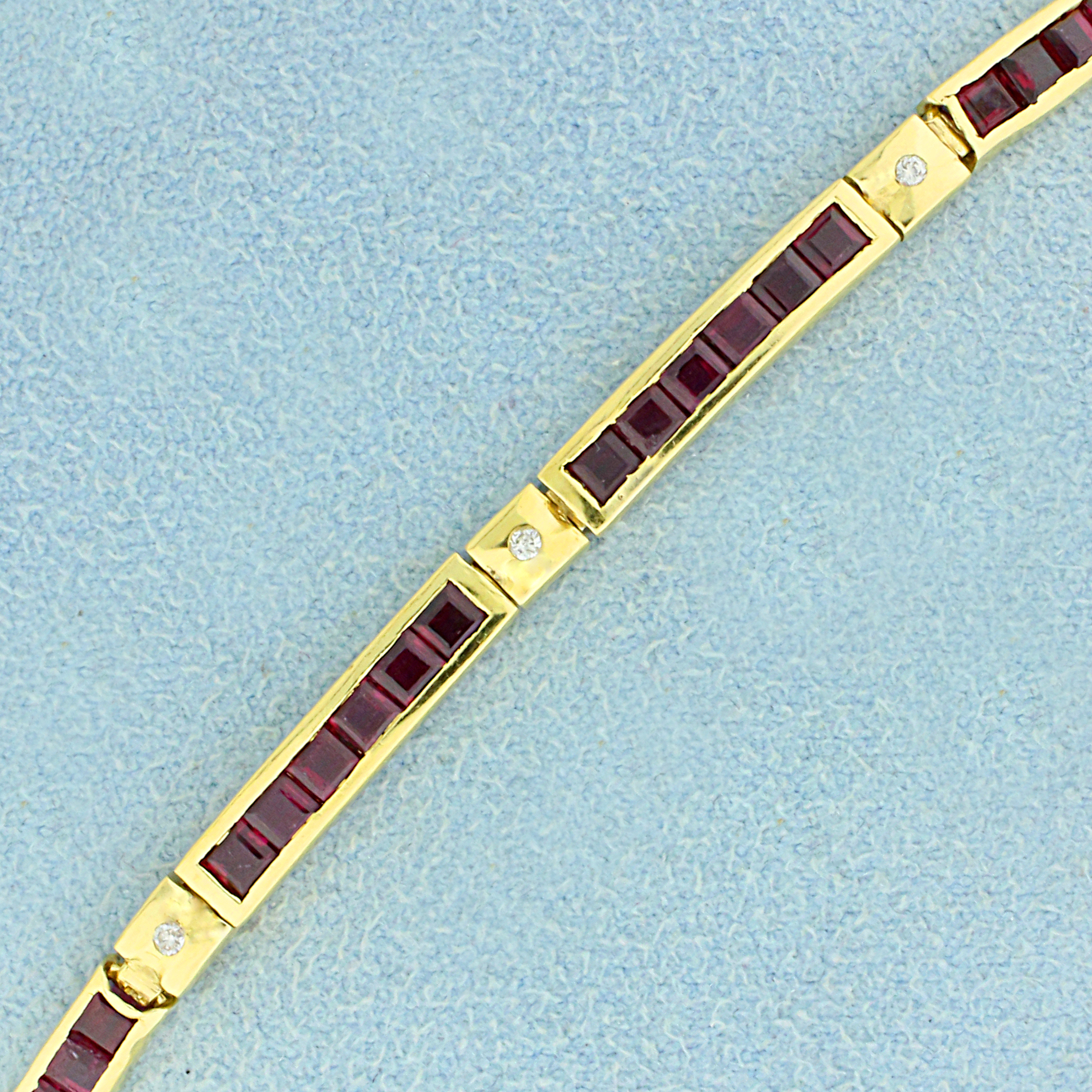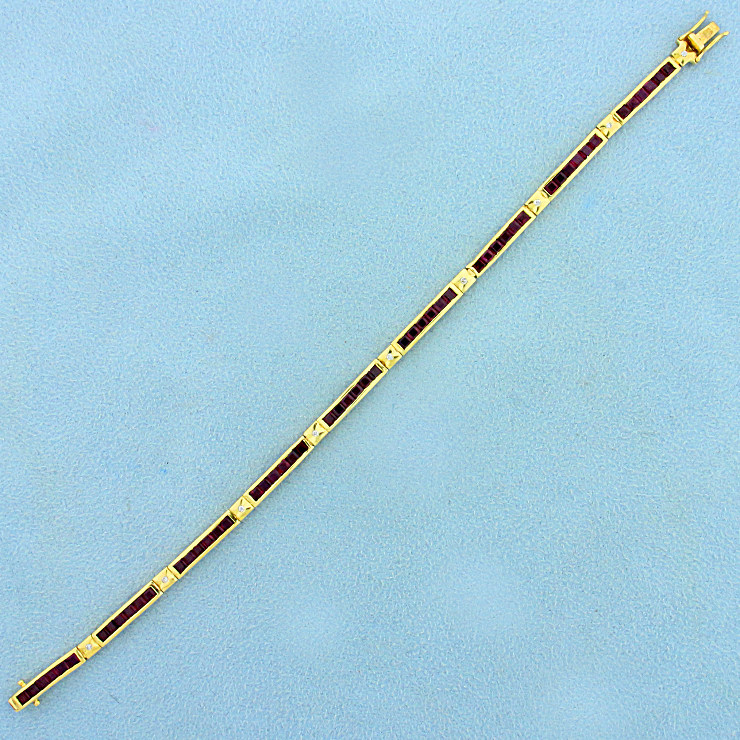 In 18K Yellow Gold. Contains fifty four high quality natural 2mm princess cut Ruby gemstones with bright color and excellent clarity. Also contains nine high quality 1/2 pt Diamond. 7 inches long. 3.4mm wide. Double safety clasp. 10.1g