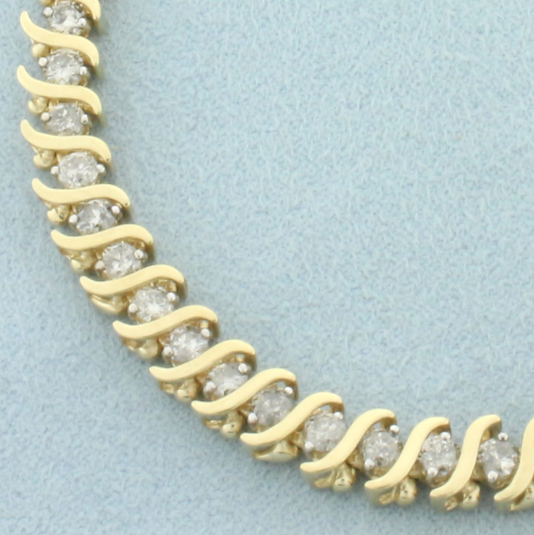In 10k yellow gold. Contains 44 high quality diamonds, 4ct TW, I color/I clarity. 7 inches long and 1/4 inches wide. Concealed slide clasp with safety latch. 13.2g.