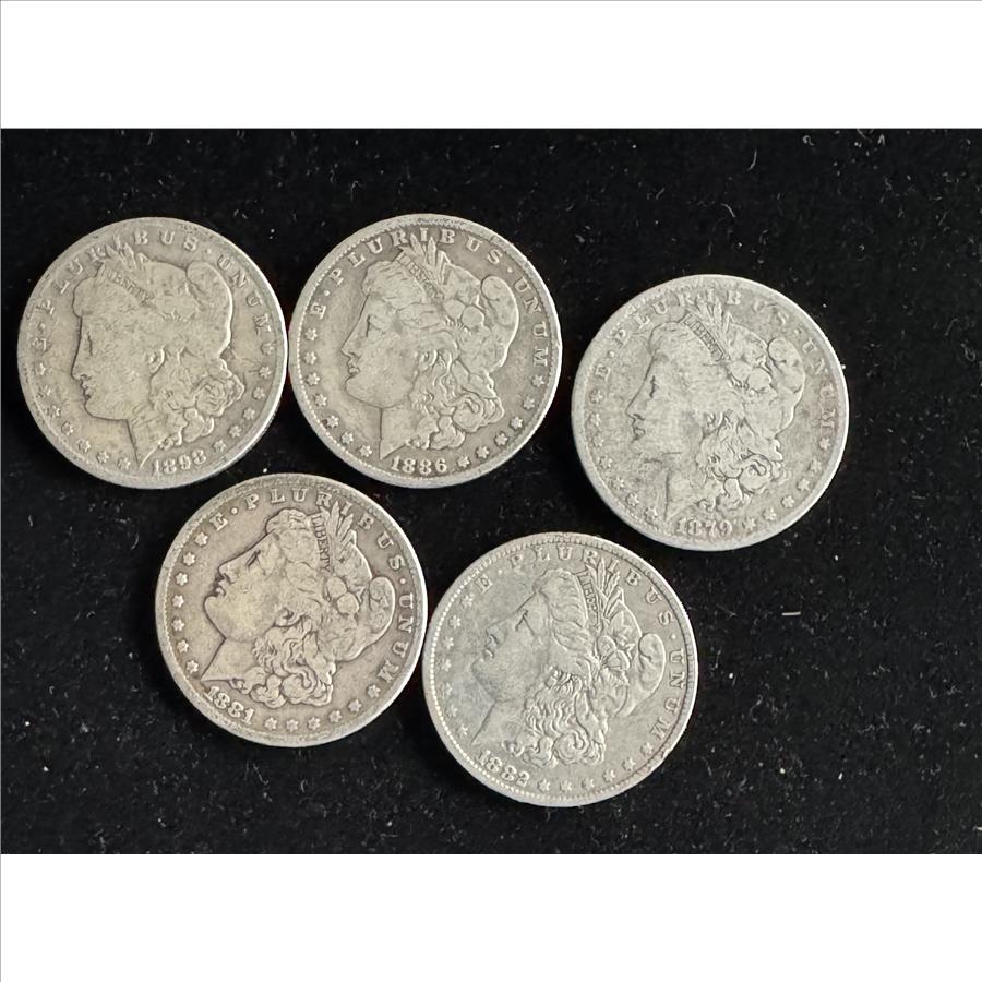 5 MORGAN SILVER DOLLARS, 1882-O, 1898-S, 1886-O, 1879, 1881-S, CLEAR DETAILS