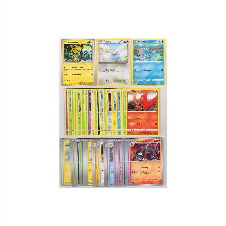 This is a collection of 50 different Pokemon trading cards.  These range from 2015 to 2024.  These are mostly in EX to Near Mint condition.  This lot includes 2023 Electabuzz, 2015 Swablu, 2023 Houndoom, and more.