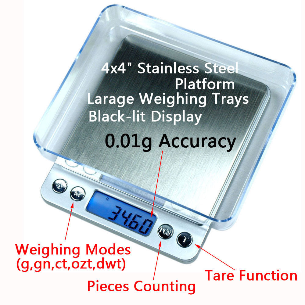 This digital scale features a moderate 500g capacity, fine 0.01g accuracy, and superb build quality. With its large 4x4" stainless steel platform and two included expansion trays, this precision scale suits for a wide variety of weighing needs (jewelry, gold, coins, herbs, hobbies, reloading, diet, etc).