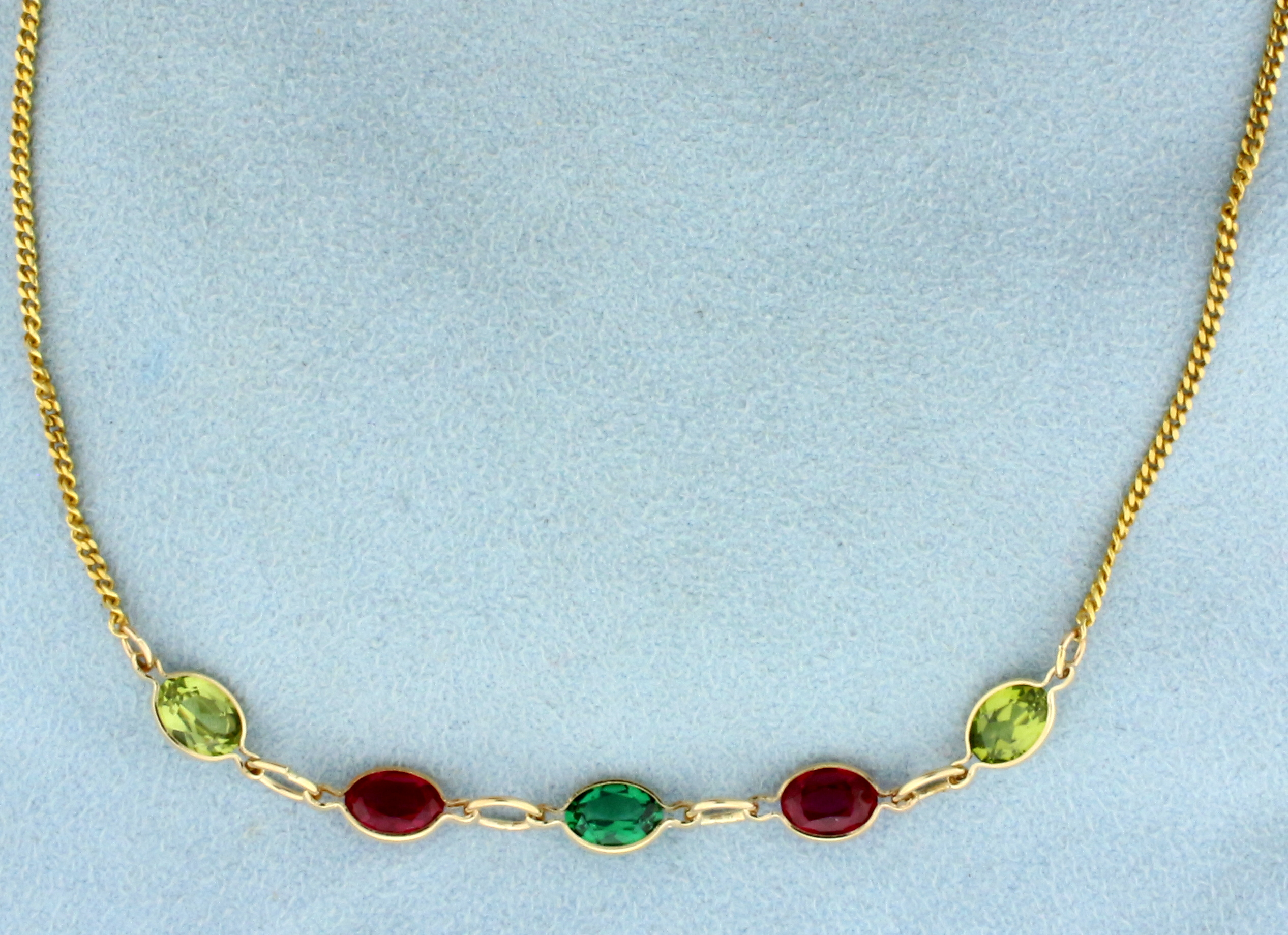 In 14K Yellow Gold. Contains one Lab Emerald, Two Lab Ruby and two Peridot high quality 7x5mm oval cut gemstones with vibrant color and excellent clarity. 18 inches long, with spring clasp. 5.2g