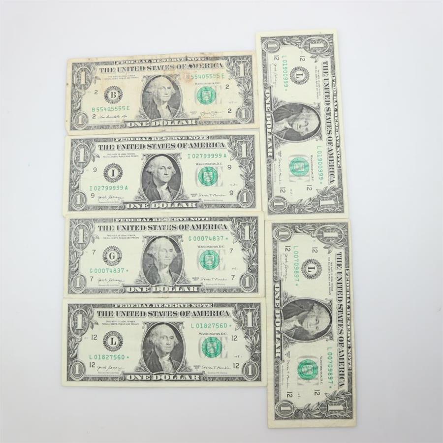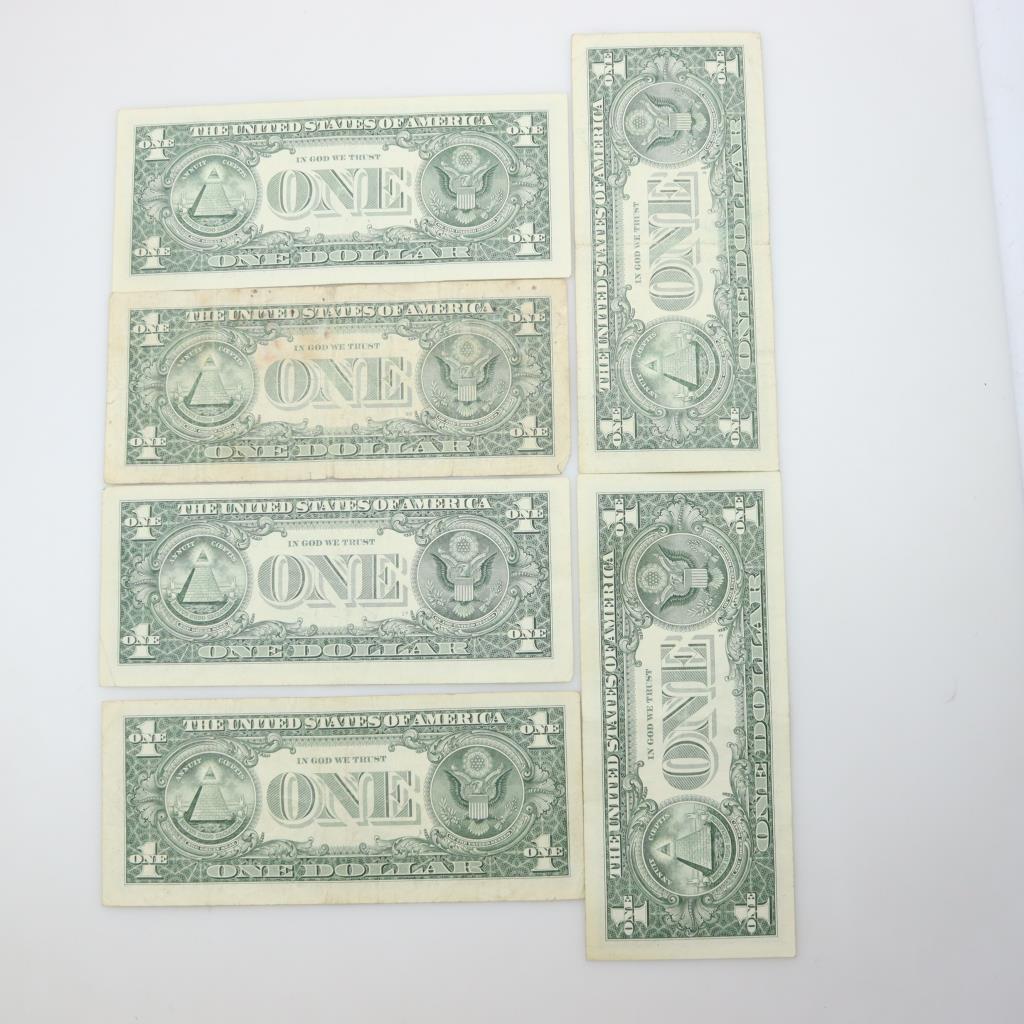6 US Federal Reserve Note $1 Dollar Bill, Includes Star Note