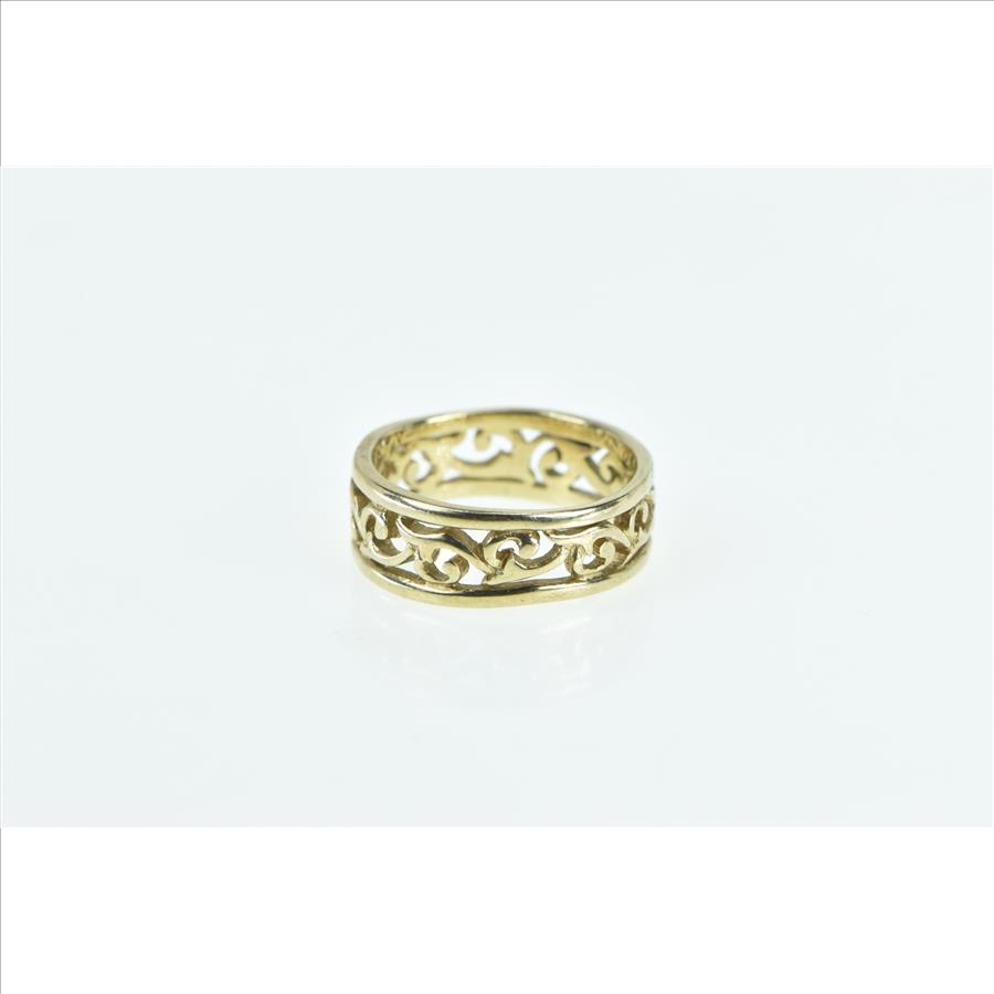 Item:  9K 7.4mm Ornate Swirl Vine Filigree Vintage Band Yellow Gold Ring, Size 7.5