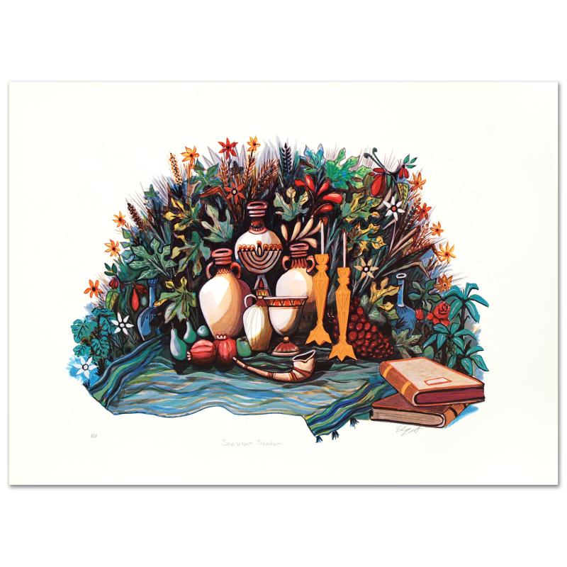 "Shabbat Shalom" is a limited edition embossed lithograph on paper, numbered and hand signed by Amram Ebgi. Includes Certificate of Authenticity! Measures approx. 19" x 14" (with border), 16" x 12" (image).