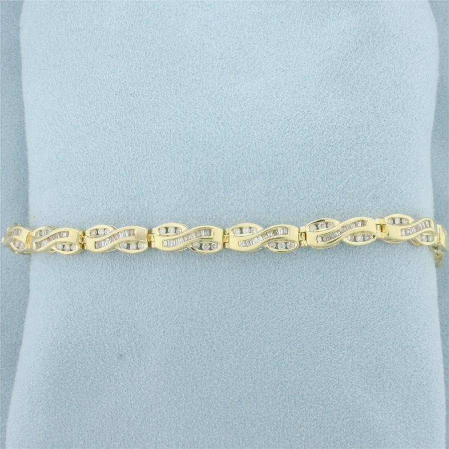 In 14k yellow gold. Contains 78 round brilliant and 130 baguette high quality diamonds, 2ct TW, I color/I clarity. 7 1/4 inches long, 5.6mm wide. Concealed slide clasp with safety latch and safety chain. 16.8g.
