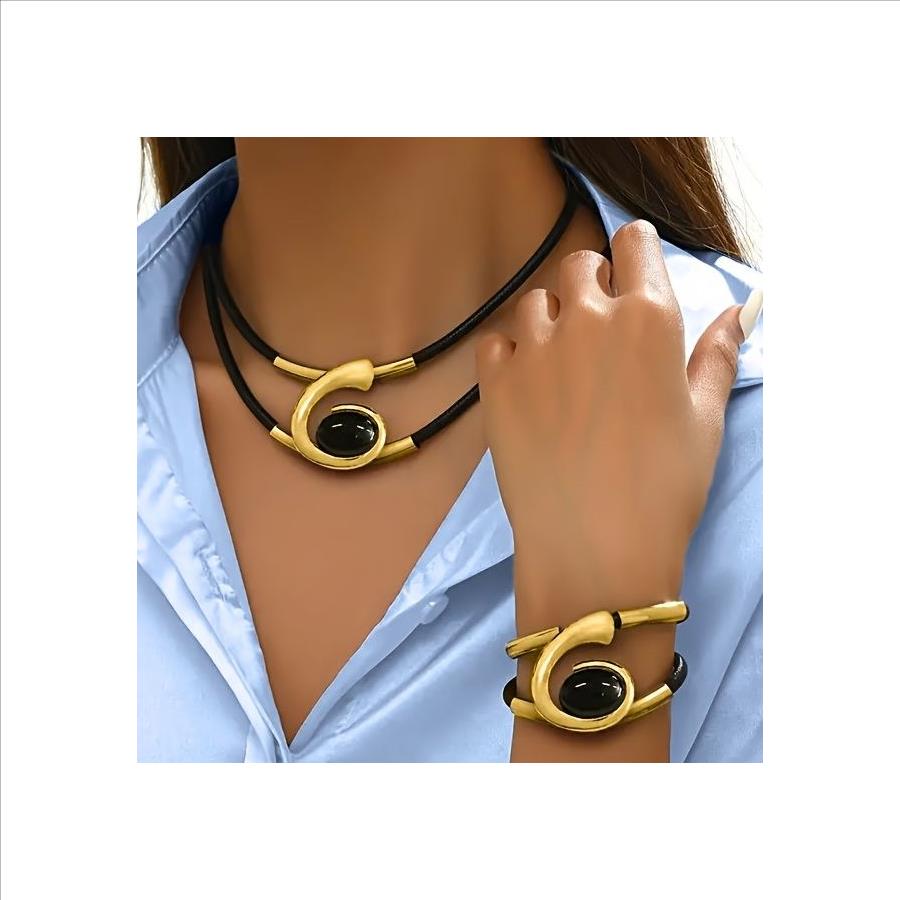Black Onyx Necklace & Bracelet Ring Set 18K Gold Overlay
