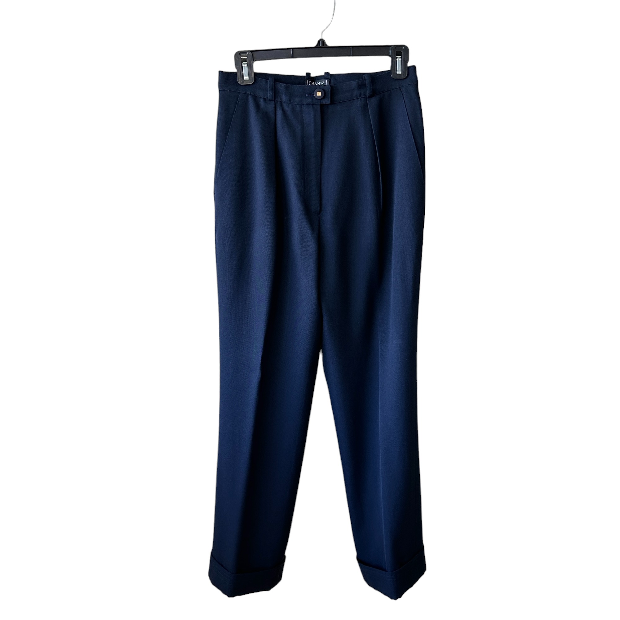 100% wool, 100% silk lining. 96A, P08799V04526, AA941, size 38. Iconic CC logo gold accented buttons. Two back pockets, subtle wide leg style with triple stitched wide cuff. Excellent vintage condition. Freshly cleaned at couture dry cleaners.