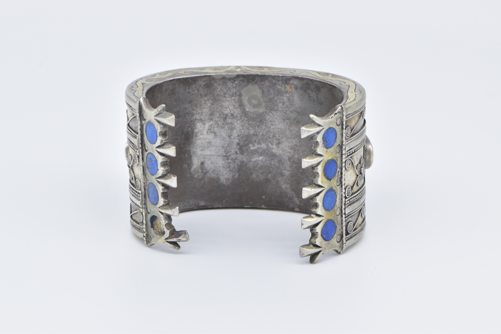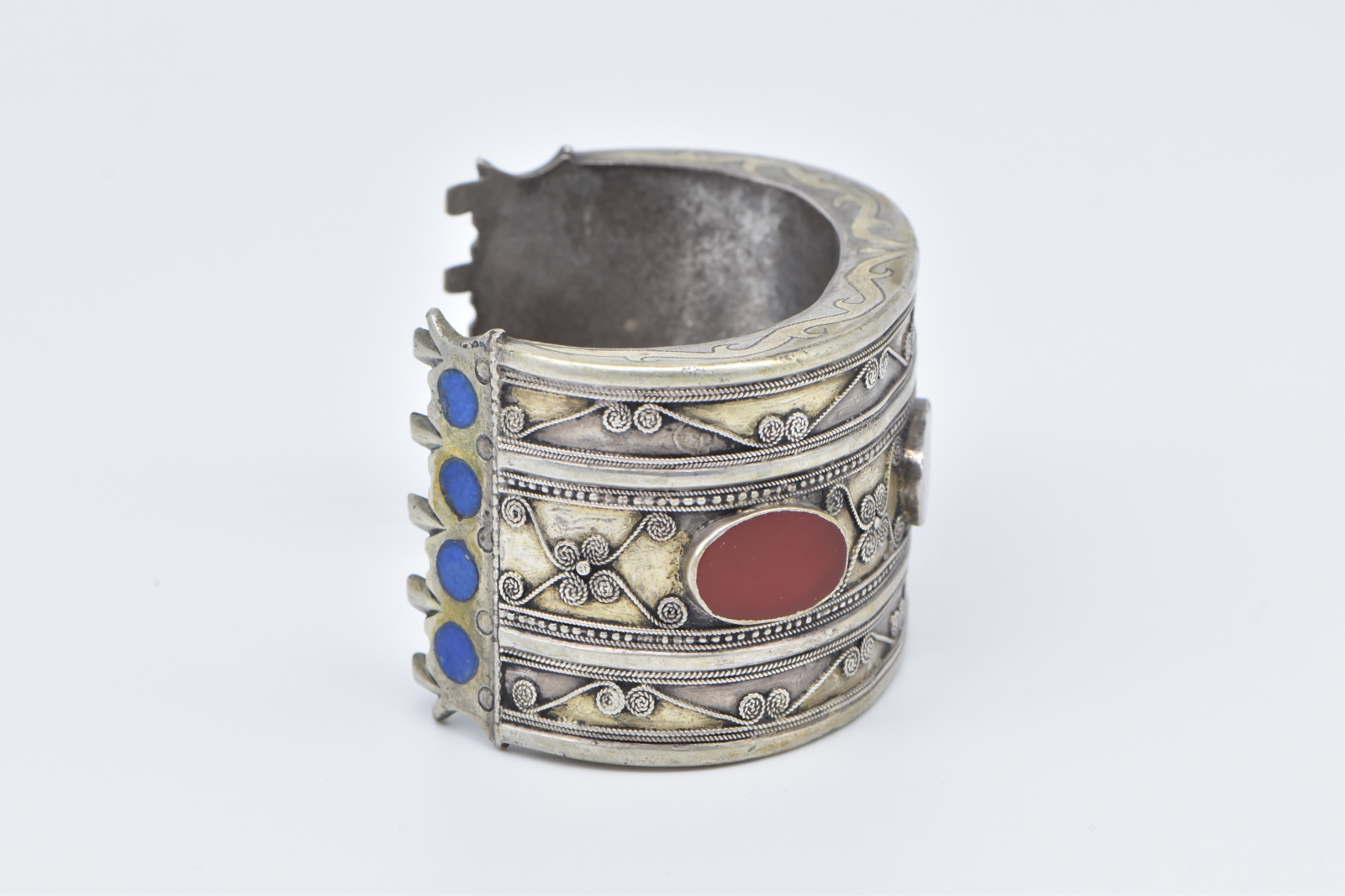 Item:  Coin Silver Ornate Carnelian Inlay Scroll Pattern Cuff Bracelet 6.5"