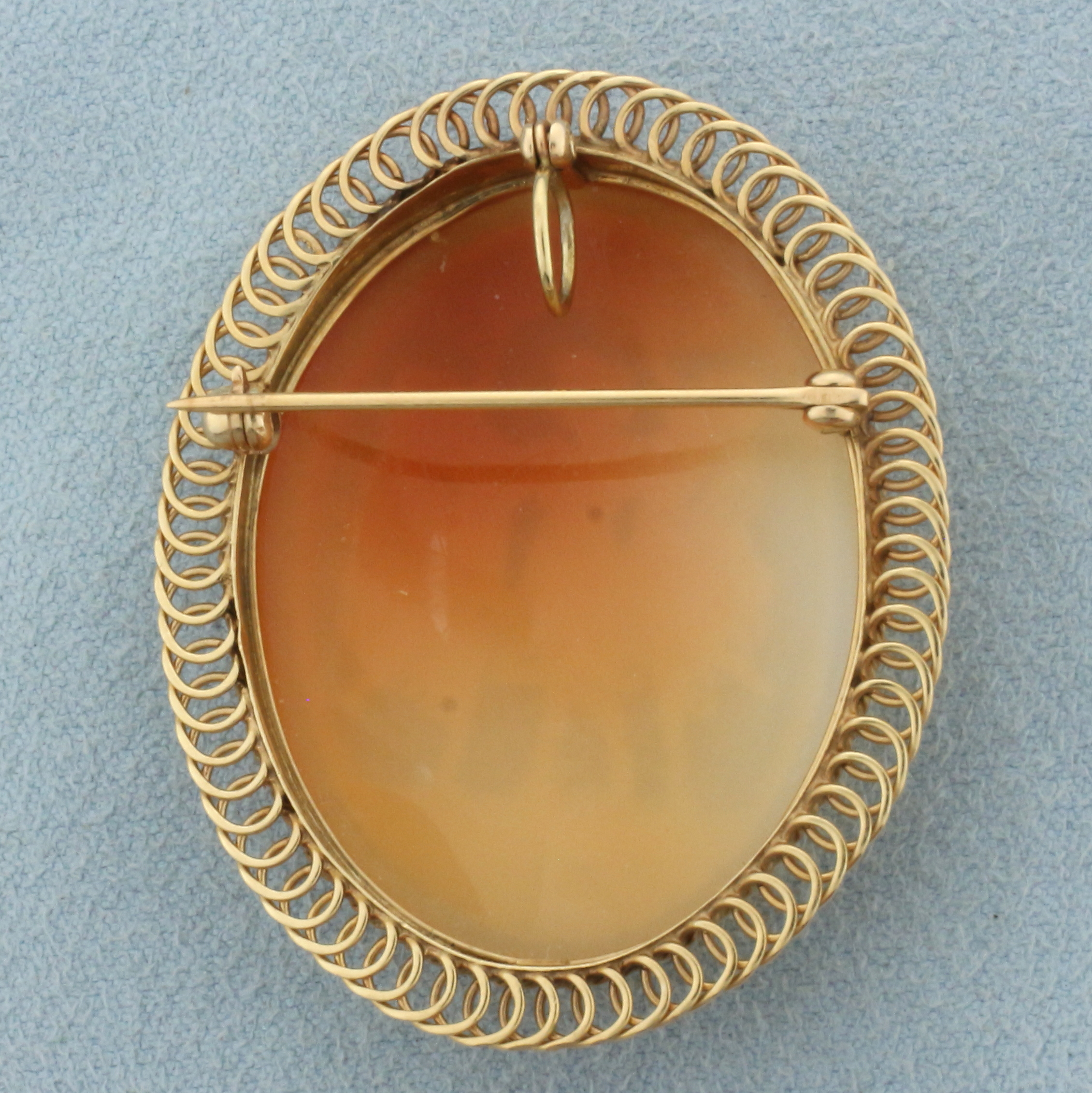 In 14k yellow gold. Hand carved shell cameo. 1 5/8 inches long x 1 3/8 inches wide. Can be worn as pin or use the swing bale to wear as pendant. 7.5g.