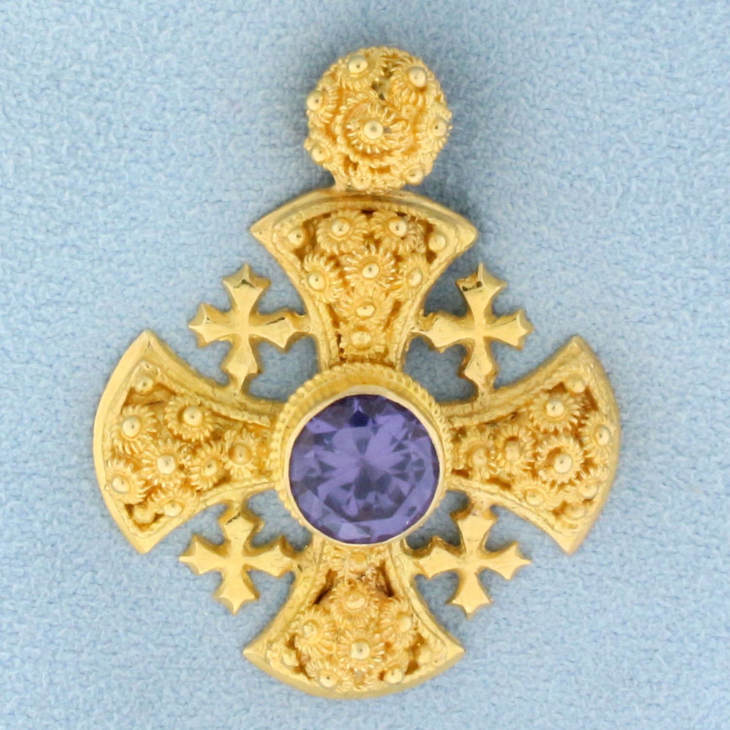 Designer Purple Sapphire Cross Pendant in 18K Yellow Gold